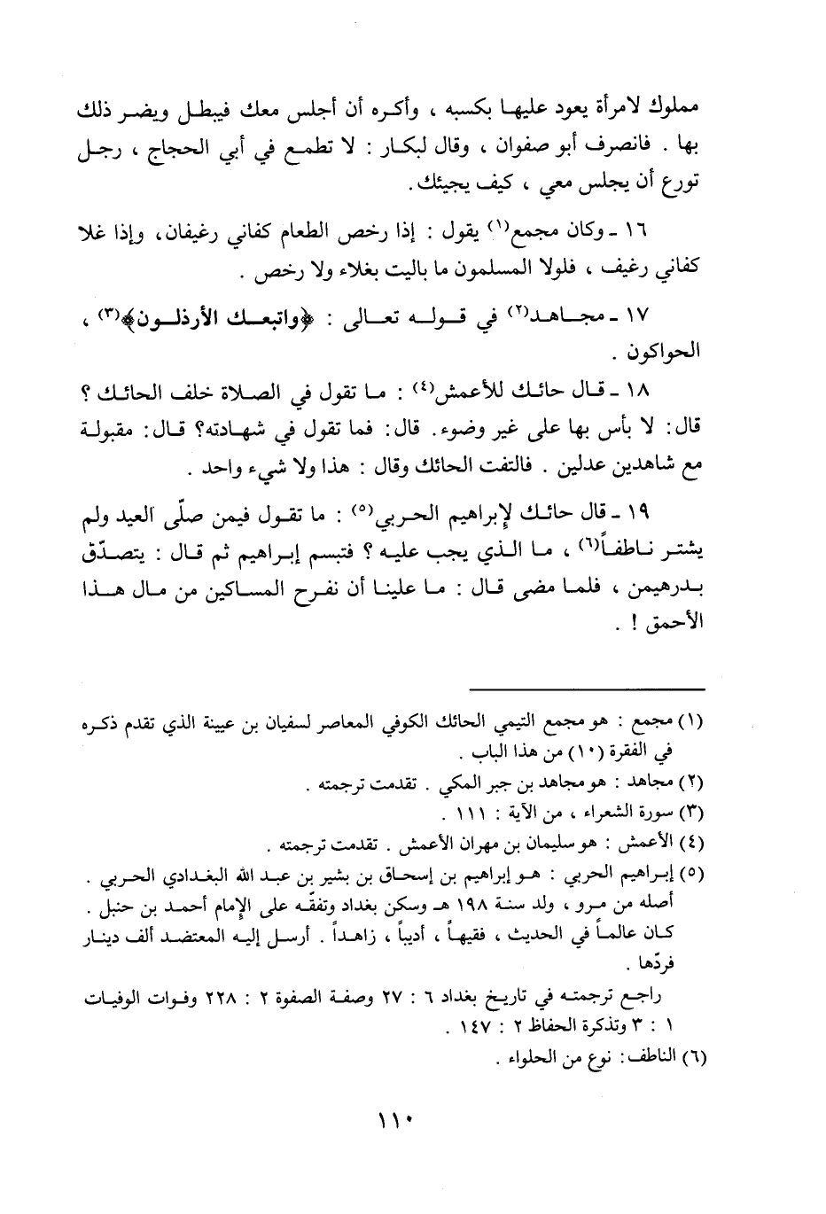 مملوك لامرأة يعود عليها بكسبه، وأكره أن أجلس معك فيبطل ويضر ذلك بها. فانصرف أبو صفوان، وقال لبكار: لا تطمع في أبي الحجاج، رجل تورع أن يجلس معي، كيف يجيئك.