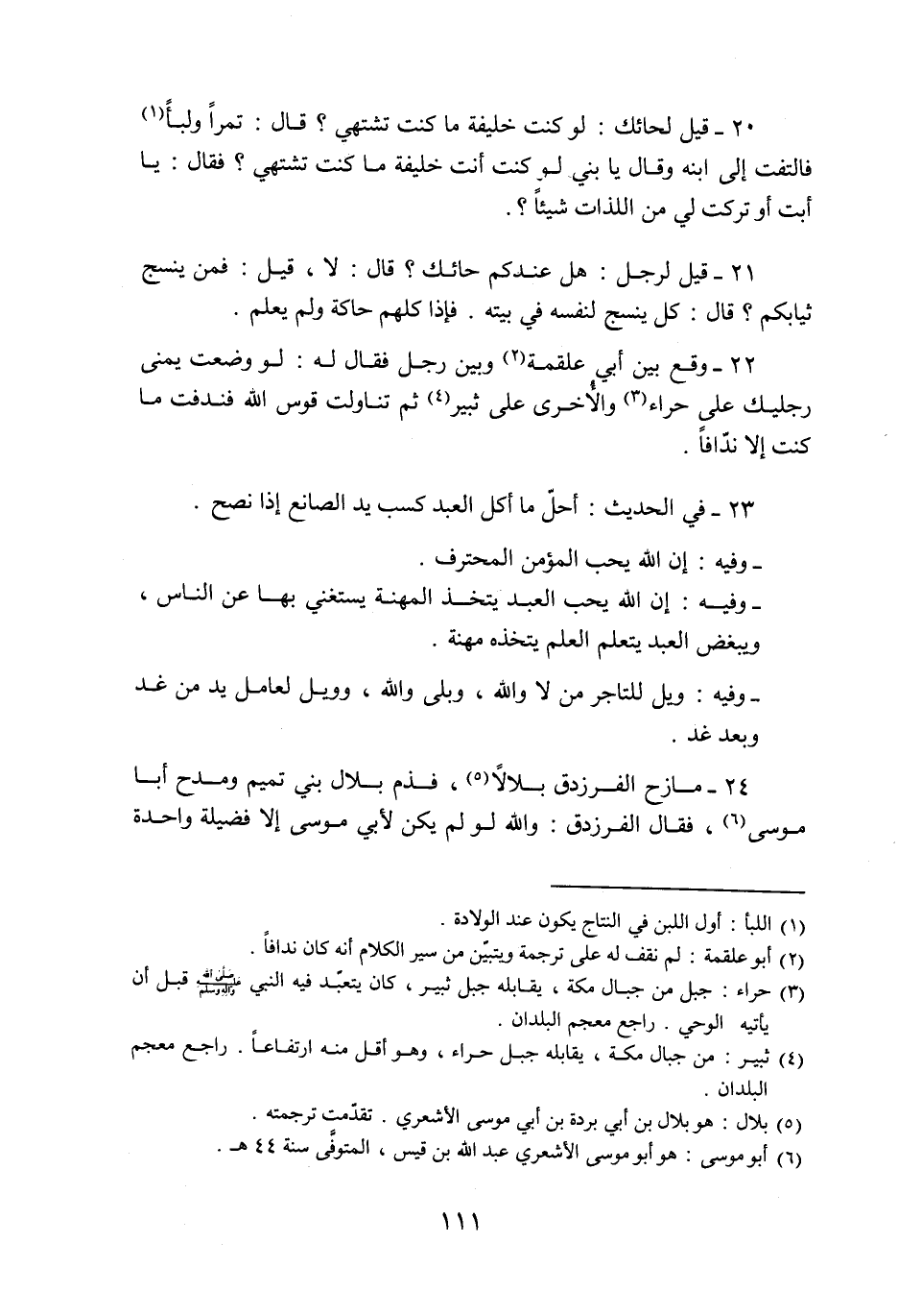 21- قيل لرجل: هل عندكم حائك؟ قال: لا، قيل: فمن ينسج ثيابكم؟ قال: كل ينسج لنفسه في بيته. فإذا كلهم حاكة ولم يعلم.