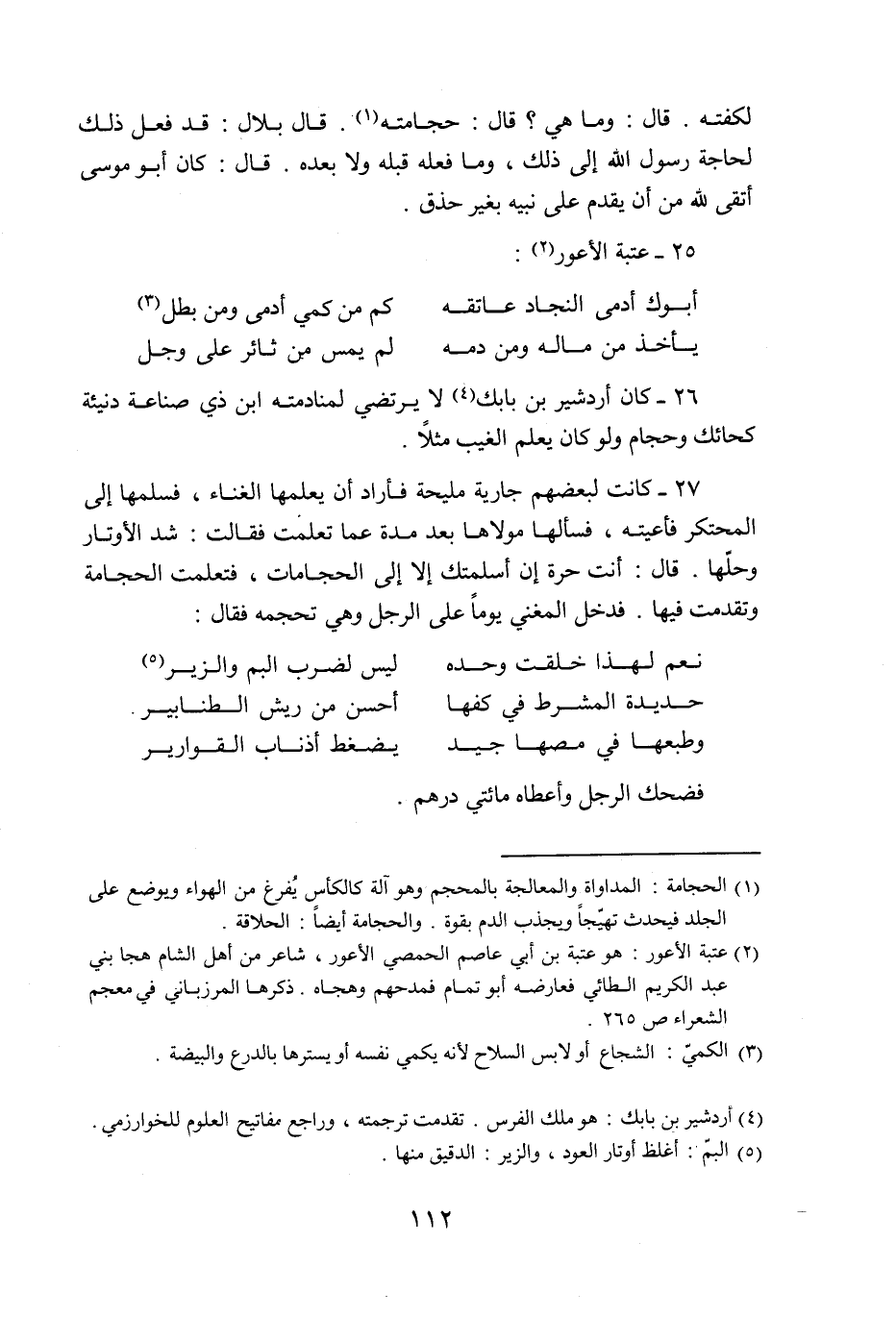 27- كانت لبعضهم جارية مليحة فأراد أن يعلمها الغناء، فسلمها إلى المحتكر فأعيته، فسألها مولاها بعد مدة عما تعلمت فقالت: شد الأوتار وحلّها. قال: أنت حرة إن أسلمتك إلا إلى الحجامات، فتعلمت الحجامة وتقدمت فيها. فدخل المغني يوما على الرجل وهي تحجمه فقال: