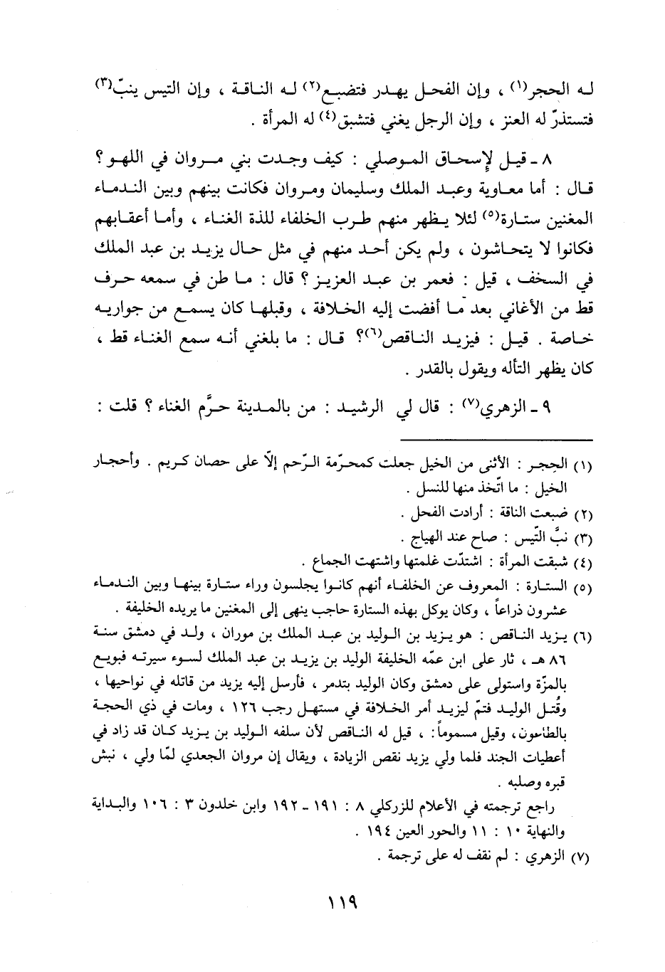 قال: أما معاوية وعبد الملك وسليمان ومروان فكانت بينهم وبين الندماء المغنين ستارة «5» لئلا يظهر منهم طرب الخلفاء للذة الغناء، وأما أعقابهم فكانوا لا يتحاشون، ولم يكن أحد منهم في مثل حال يزيد بن عبد الملك في السخف، قيل: فعمر بن عبد العزيز؟ قال: ما طن في سمعه حرف قط من الأغاني بعد ما أفضت إليه الخلافة، وقبلها كان يسمع من جواريه خاصة. قيل: فيزيد الناقص «6» ؟ قال: ما بلغني أنه سمع الغناء قط، كان يظهر التأله ويقول بالقدر.