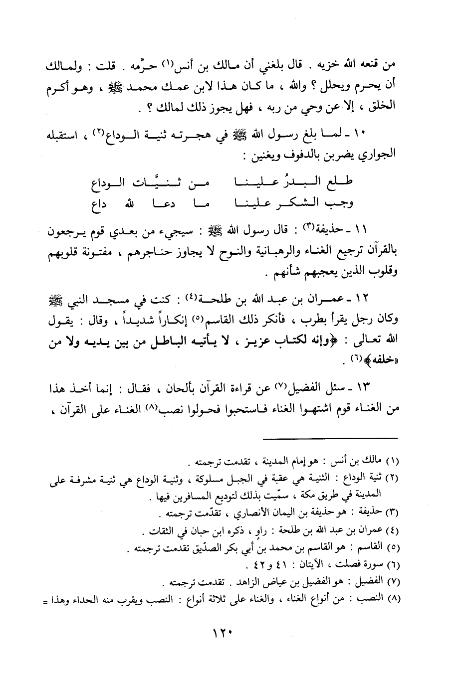 13- سئل الفضيل «7» عن قراءة القرآن بألحان، فقال: إنما أخذ هذا من الغناء قوم اشتهوا الغناء فاستحبوا فحولوا نصب «8» الغناء على القرآن،