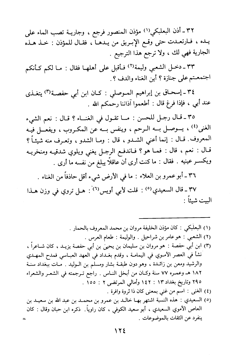 32- أذن البعلبكي «1» مؤذن المنصور فرجع، وجارية تصب الماء على يده، فارتعدت حتى وقع الإبريق من يدها، فقال للمؤذن: خذ هذه الجارية فهي لك، ولا ترجع هذا الترجيع.
