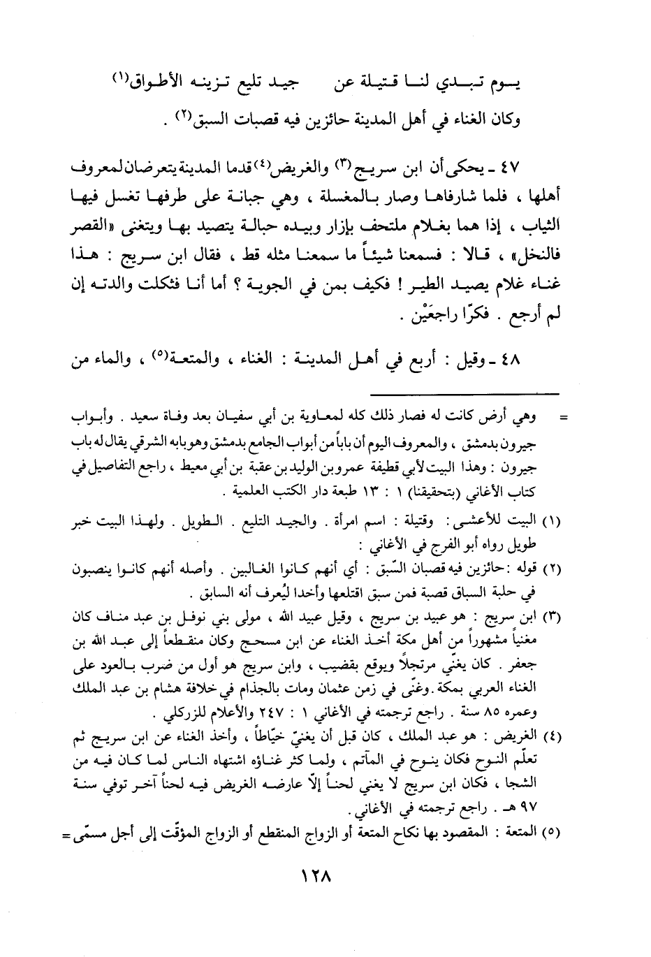 47- يحكى أن ابن سريج «3» والغريض «4» قدما المدينة يتعرضان لمعروف أهلها، فلما شارفاها وصار بالمغسلة، وهي جبانة على طرفها تغسل فيها الثياب، إذا هما بغلام ملتحف بإزار وبيده حبالة يتصيد بها ويتغنى «القصر فالنخل» ، قالا: فسمعنا شيئا ما سمعنا مثله قط، فقال ابن سريج: هذا غناء غلام يصيد الطير! فكيف بمن في الجوية؟ أما أنا فثكلت والدته إن لم أرجع. فكرّا راجعين.