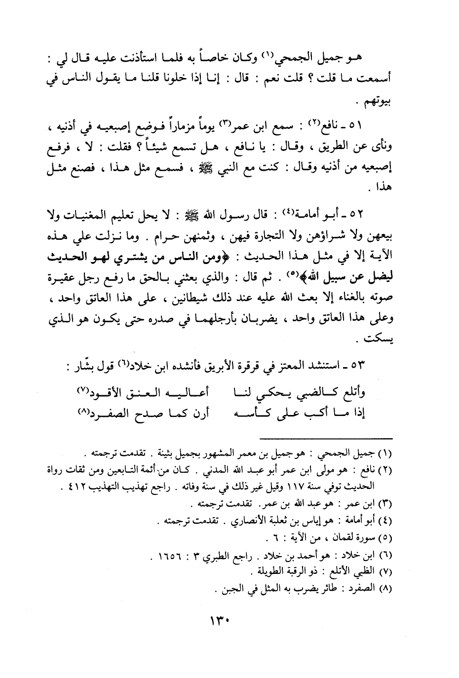 52- أبو أمامة «4» : قال رسول الله صلّى الله عليه وسلّم: لا يحل تعليم المغنيات ولا بيعهن ولا شراؤهن ولا التجارة فيهن، وثمنهن حرام. وما نزلت علي هذه الآية إلا في مثل هذا الحديث: وَمِنَ النَّاسِ مَنْ يَشْتَرِي لَهْوَ الْحَدِيثِ لِيُضِلَّ عَنْ سَبِيلِ اللَّهِ