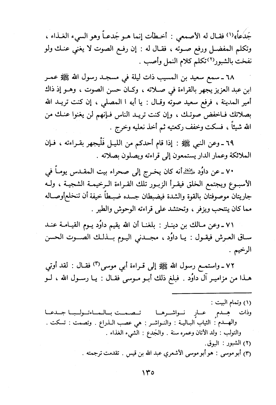 72- واستمع رسول الله صلّى الله عليه وسلّم إلى قراءة أبي موسى «3» فقال: لقد أوتي هذا من مزامير آل داود. فبلغ ذلك أبو موسى فقال: يا رسول الله، لو