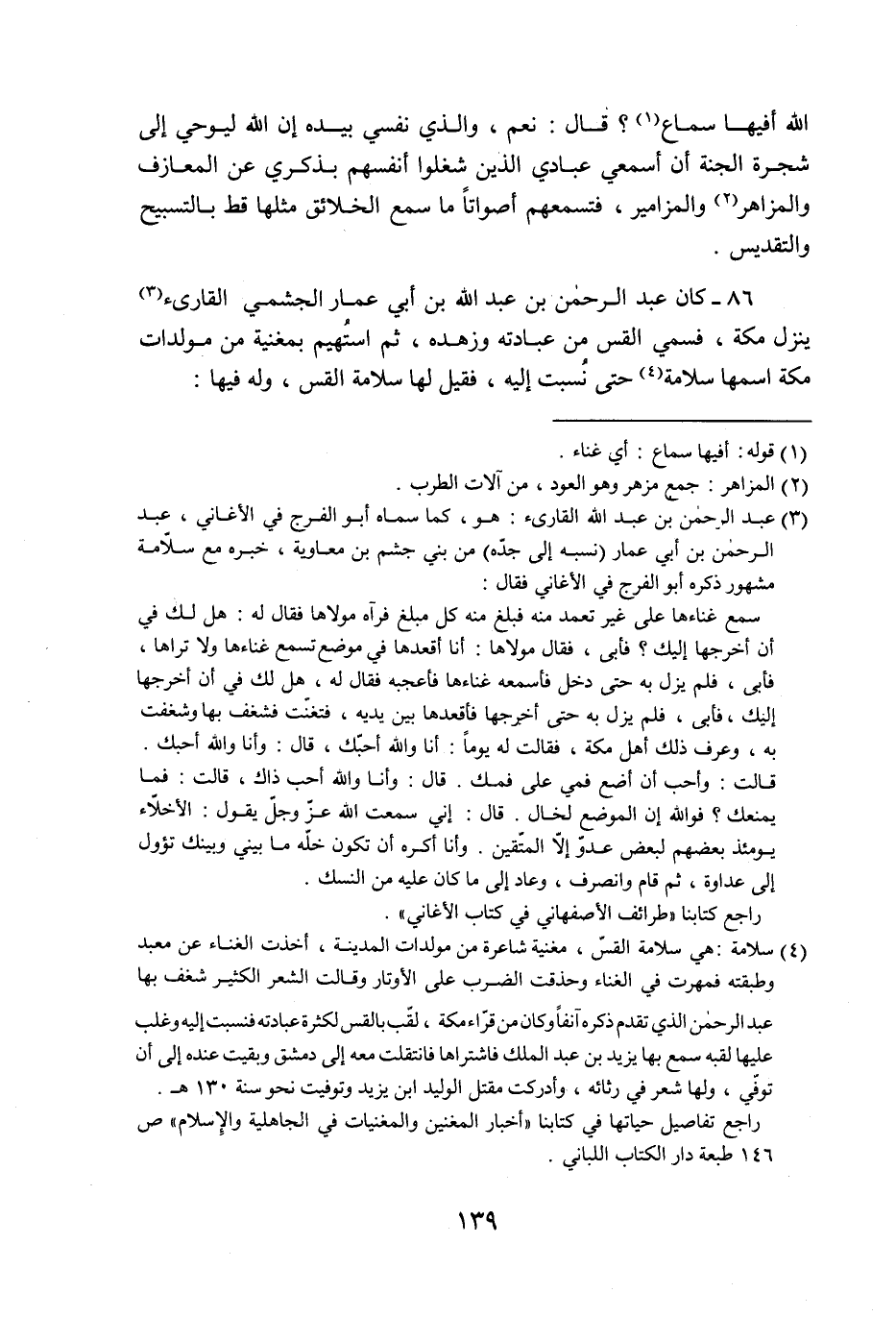 86- كان عبد الرحمن بن عبد الله بن أبي عمار الجشمي القارىء «3» ينزل مكة، فسمي القس من عبادته وزهده، ثم استهيم بمغنية من مولدات مكة اسمها سلامة «4» حتى نسبت إليه، فقيل لها سلامة القس، وله فيها: