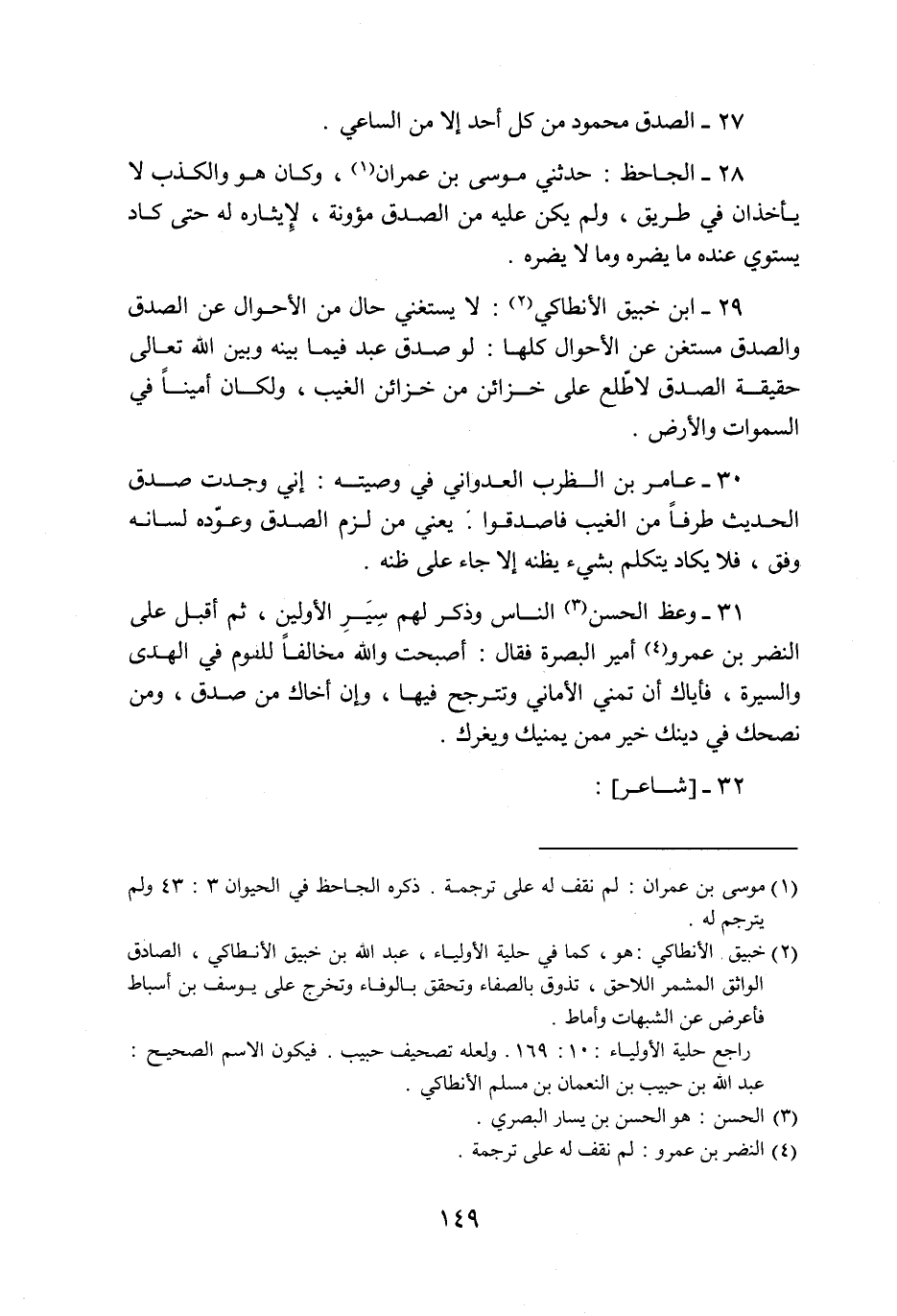 28- الجاحظ: حدثني موسى بن عمران «1» ، وكان هو والكذب لا يأخذان في طريق، ولم يكن عليه من الصدق مؤونة، لإيثاره له حتى كاد يستوي عنده ما يضره وما لا يضره.