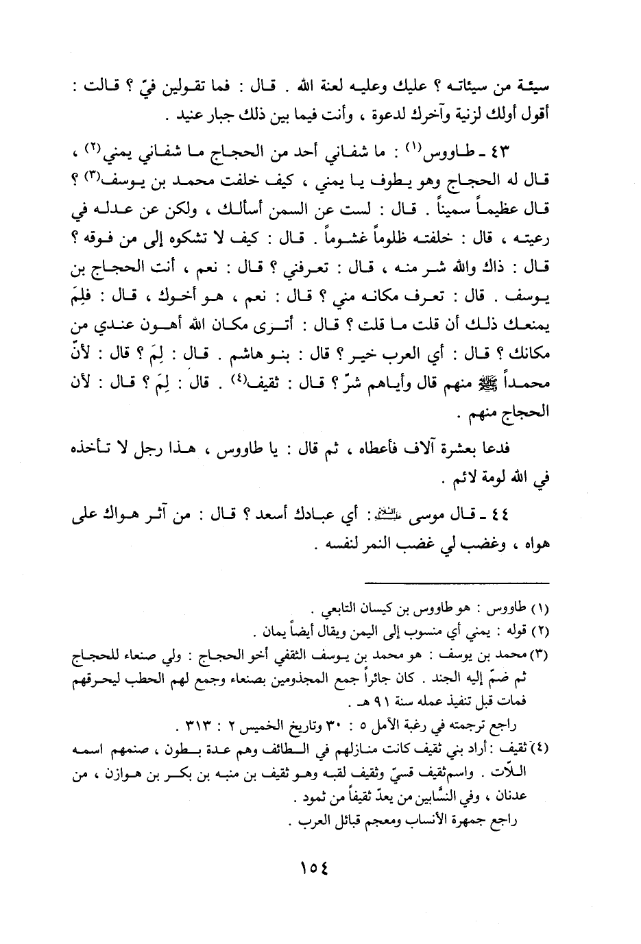 43- طاووس «1» : ما شفاني أحد من الحجاج ما شفاني يمني «2» ، قال له الحجاج وهو يطوف يا يمني، كيف خلفت محمد بن يوسف «3» ؟