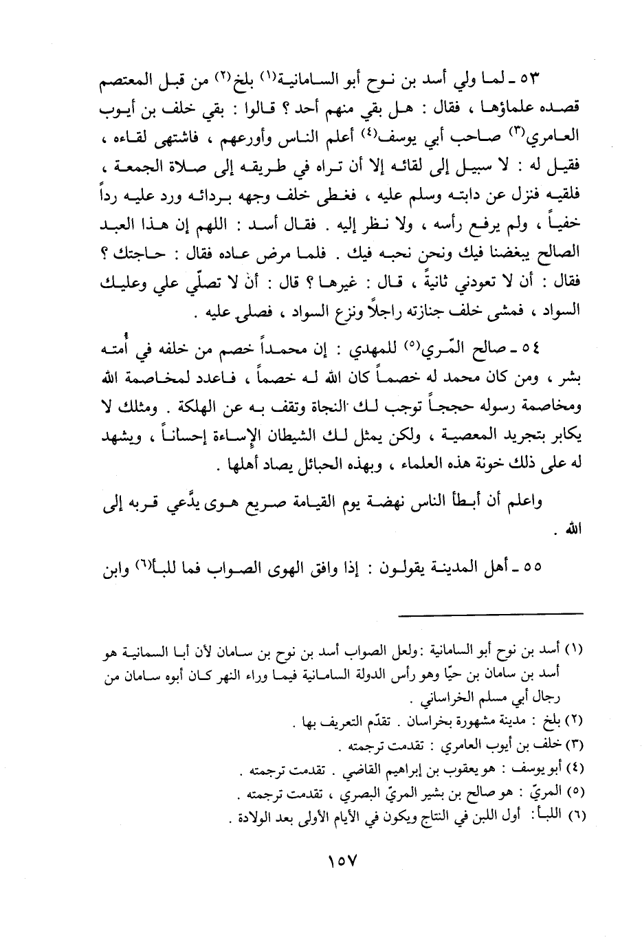 53- لما ولي أسد بن نوح أبو السامانية «1» بلخ «2» من قبل المعتصم قصده علماؤها، فقال: هل بقي منهم أحد؟ قالوا: بقي خلف بن أيوب العامري «3» صاحب أبي يوسف «4» أعلم الناس وأورعهم، فاشتهى لقاءه، فقيل له: لا سبيل إلى لقائه إلا أن تراه في طريقه إلى صلاة الجمعة، فلقيه فنزل عن دابته وسلم عليه، فغطى خلف وجهه بردائه ورد عليه ردا خفيا، ولم يرفع رأسه، ولا نظر إليه. فقال أسد: اللهم إن هذا العبد الصالح يبغضنا فيك ونحن نحبه فيك. فلما مرض عاده فقال: حاجتك؟