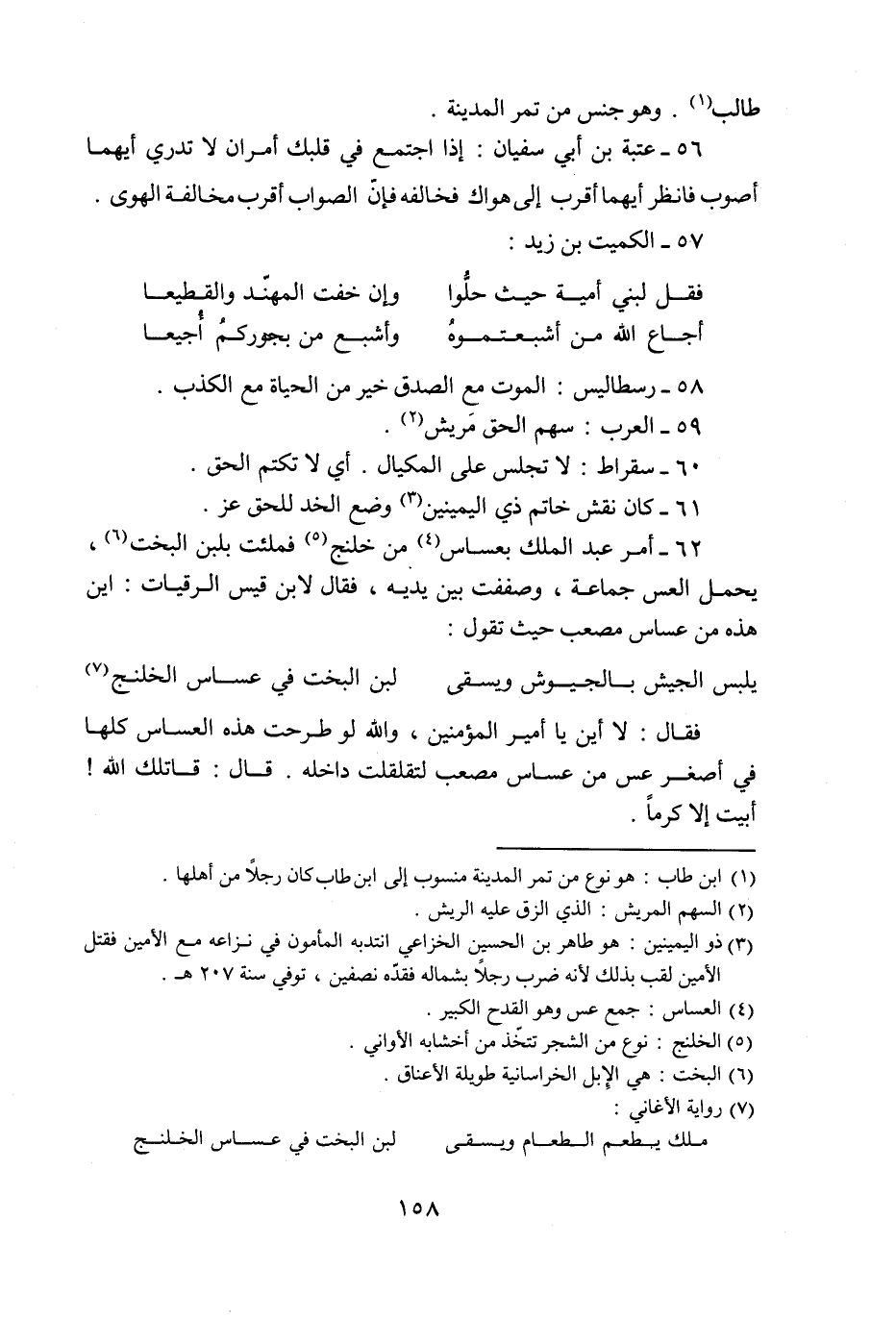 62- أمر عبد الملك بعساس «4» من خلنج «5» فملئت بلبن البخت «6» ، يحمل العس جماعة، وصففت بين يديه، فقال لابن قيس الرقيات: اين هذه من عساس مصعب حيث تقول: