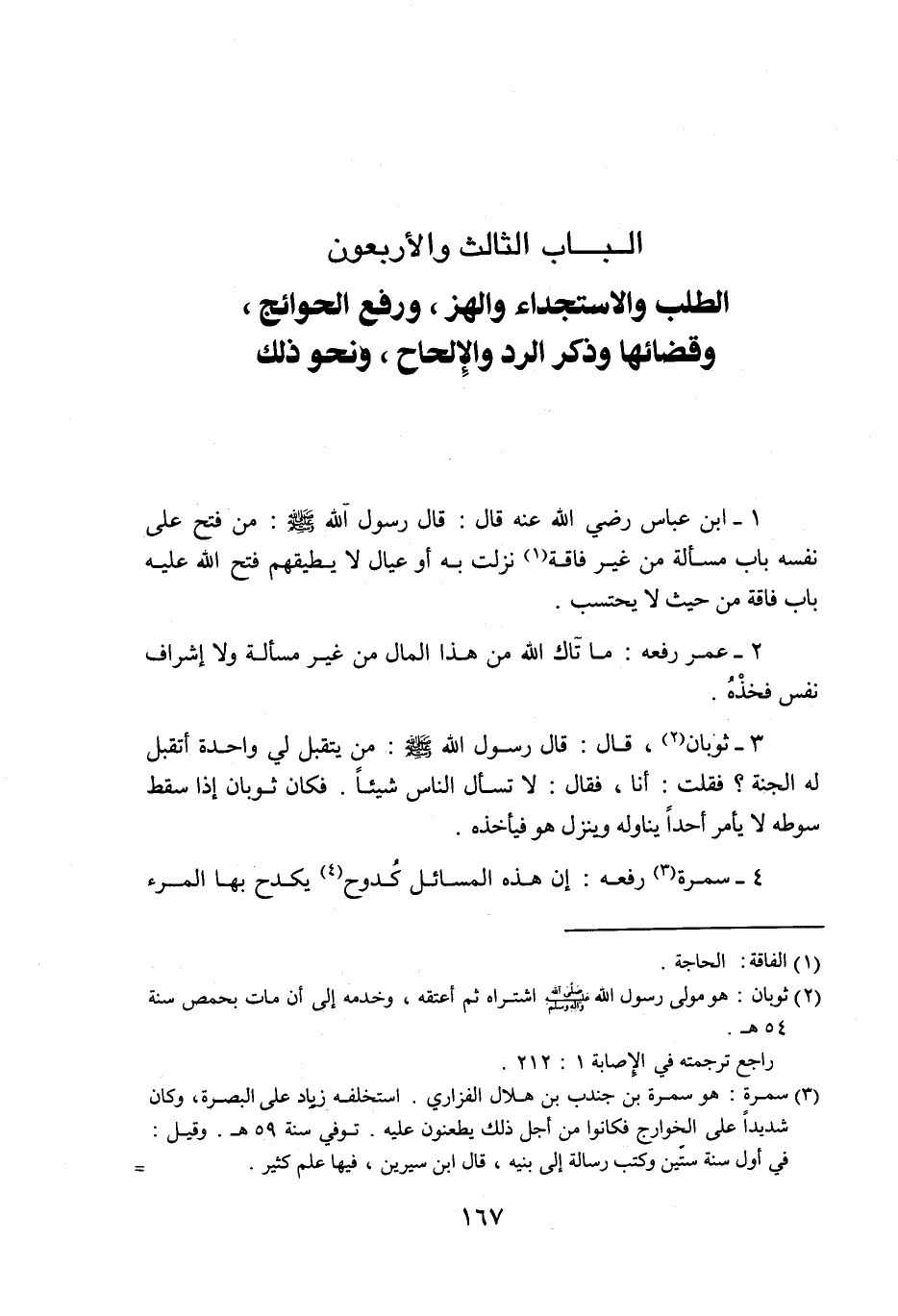 3- ثوبان «2» ، قال: قال رسول الله صلّى الله عليه وسلّم: من يتقبل لي واحدة أتقبل له الجنة؟ فقلت: أنا، فقال: لا تسأل الناس شيئا. فكان ثوبان إذا سقط سوطه لا يأمر أحدا يناوله وينزل هو فيأخذه.