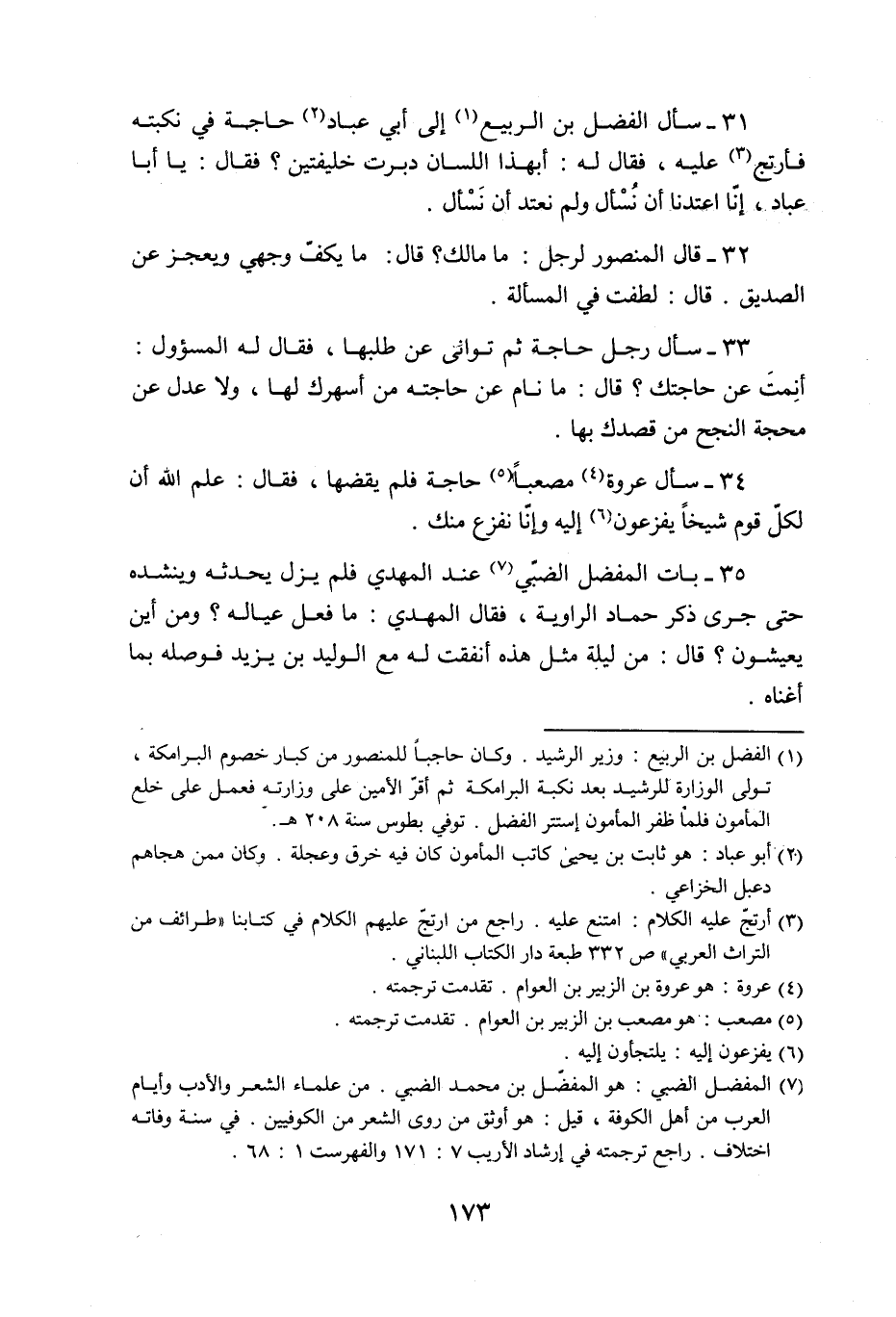 31- سأل الفضل بن الربيع «1» إلى أبي عباد «2» حاجة في نكبته فأرتج «3» عليه، فقال له: أبهذا اللسان دبرت خليفتين؟ فقال: يا أبا عباد، إنّا اعتدنا أن نسأل ولم نعتد أن نسأل.