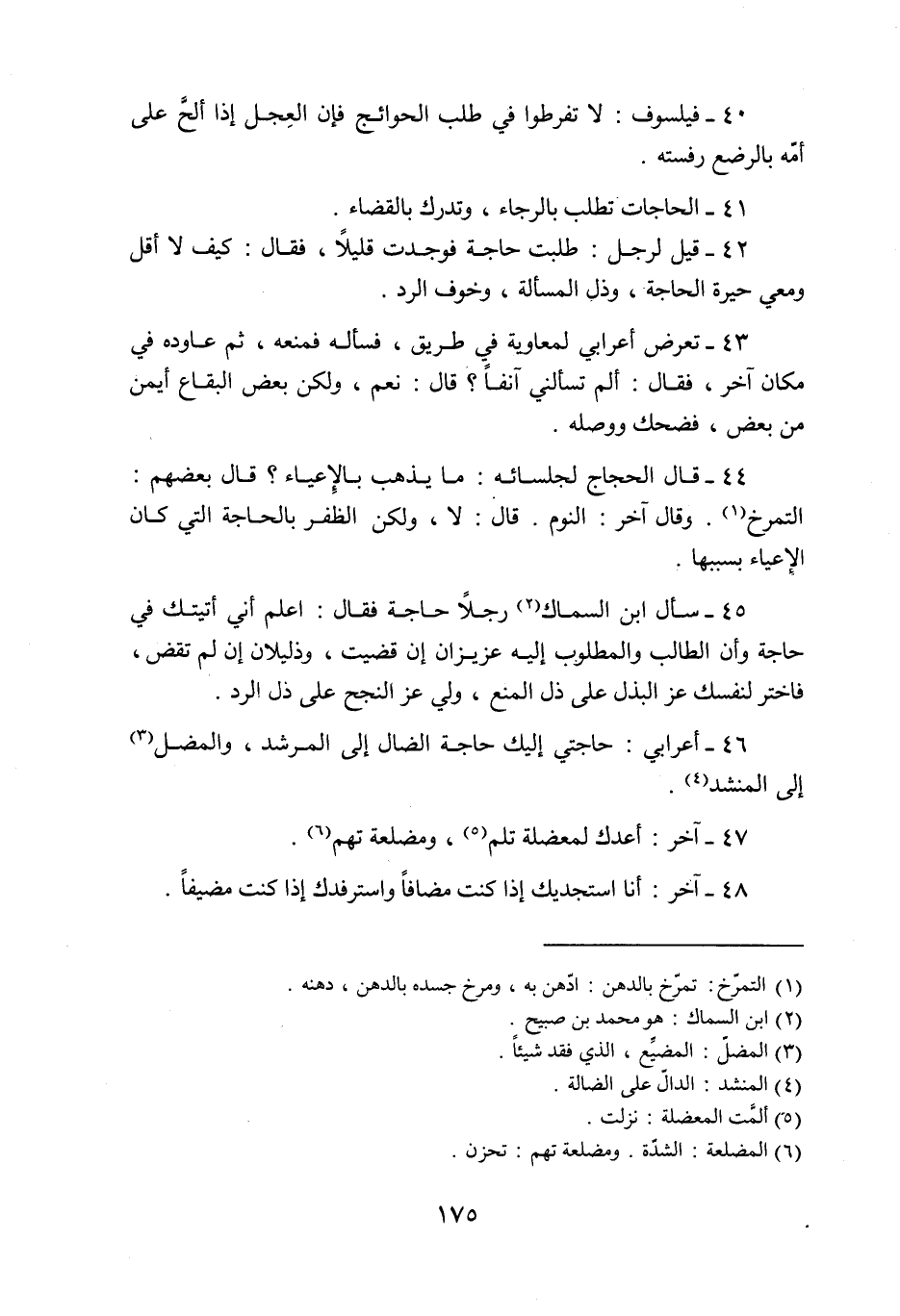 46- أعرابي: حاجتي إليك حاجة الضال إلى المرشد، والمضل «3» إلى المنشد «4» .