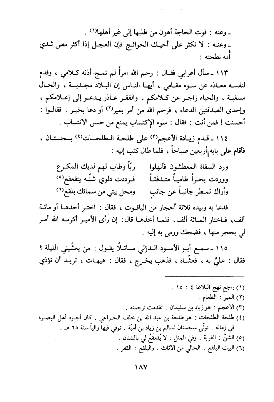 114- قدم زيادة الأعجم «3» على طلحة الطلحات «4» بسجستان، فأقام على بابه أربعين صباحا، فلما طال كتب إليه: