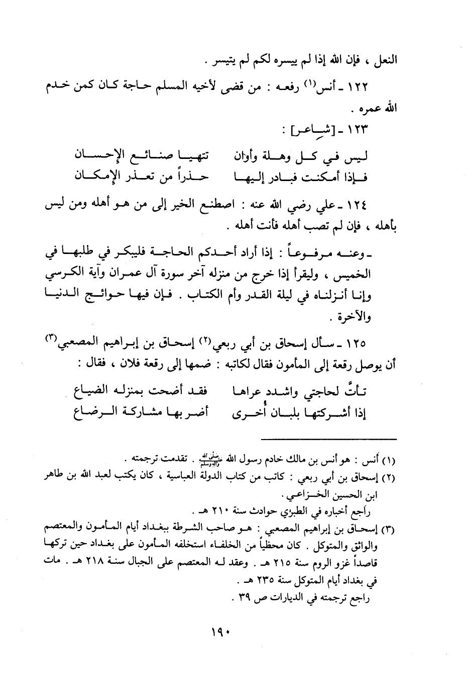 125- سأل إسحاق بن أبي ربعي «2» إسحاق بن إبراهيم المصعبي «3» أن يوصل رقعة إلى المأمون فقال لكاتبه: ضمها إلى رقعة فلان، فقال: