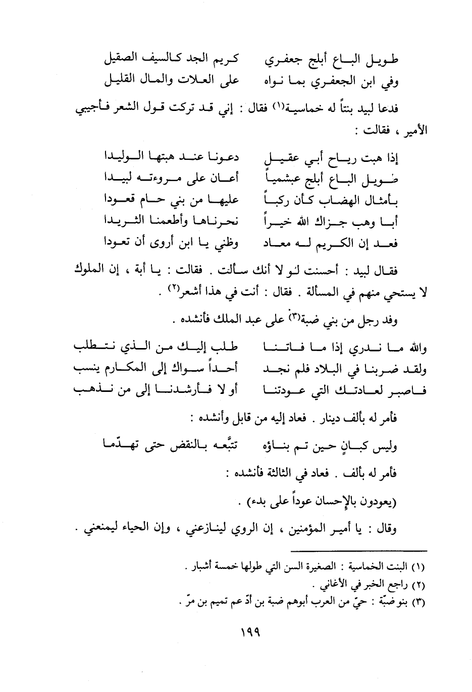 فقال لبيد: أحسنت لولا أنك سألت. فقالت: يا أبة، إن الملوك لا يستحي منهم في المسألة. فقال: أنت في هذا أشعر «2» .