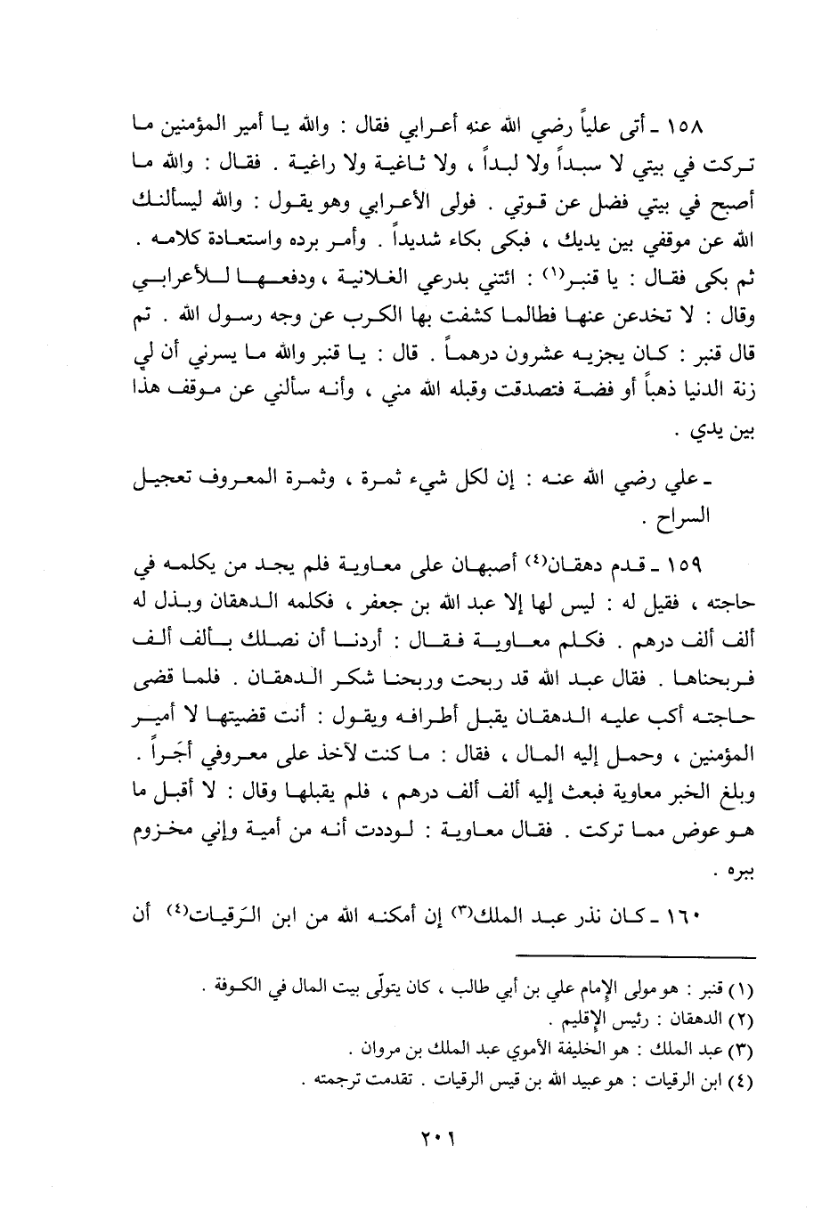158- أتى عليا رضي الله عنه أعرابي فقال: والله يا أمير المؤمنين ما تركت في بيتي لا سبدا ولا لبدا، ولا ثاغية ولا راغية. فقال: والله ما أصبح في بيتي فضل عن قوتي. فولى الأعرابي وهو يقول: والله ليسألنك الله عن موقفي بين يديك، فبكى بكاء شديدا. وأمر برده واستعادة كلامه.