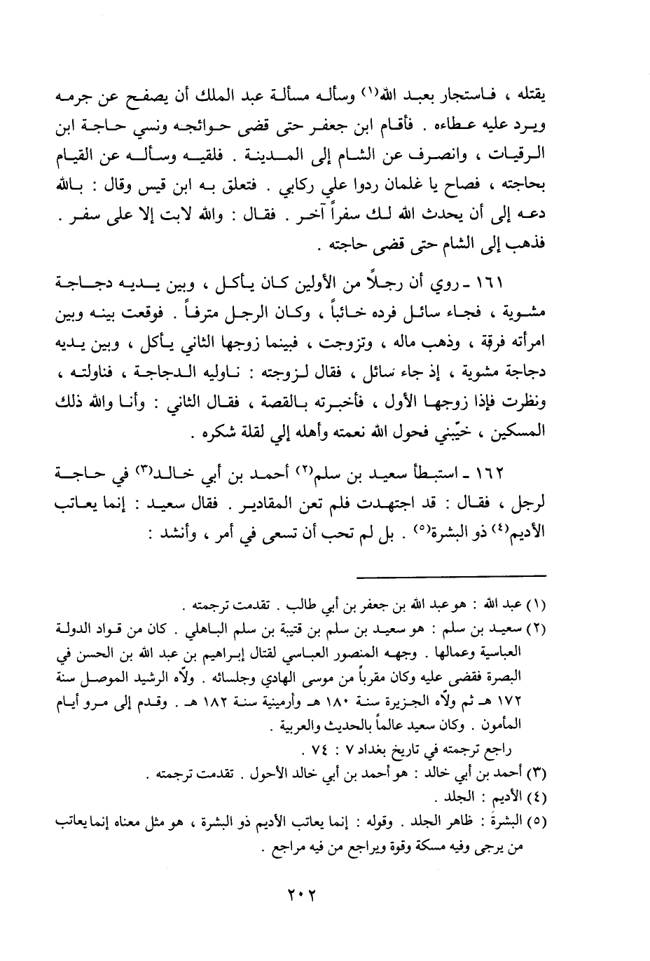 162- استبطأ سعيد بن سلم «2» أحمد بن أبي خالد «3» في حاجة لرجل، فقال: قد اجتهدت فلم تعن المقادير. فقال سعيد: إنما يعاتب الأديم «4» ذو البشرة «5» . بل لم تحب أن تسعى في أمر، وأنشد: