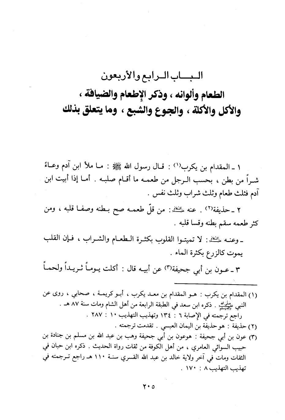 1- المقدام بن يكرب «1» : قال رسول الله صلّى الله عليه وسلّم: ما ملأ ابن آدم وعاء شرا من بطن، بحسب الرجل من طعمه ما أقام صلبه. أما إذا أبيت ابن آدم فثلث طعام وثلث شراب وثلث نفس.
