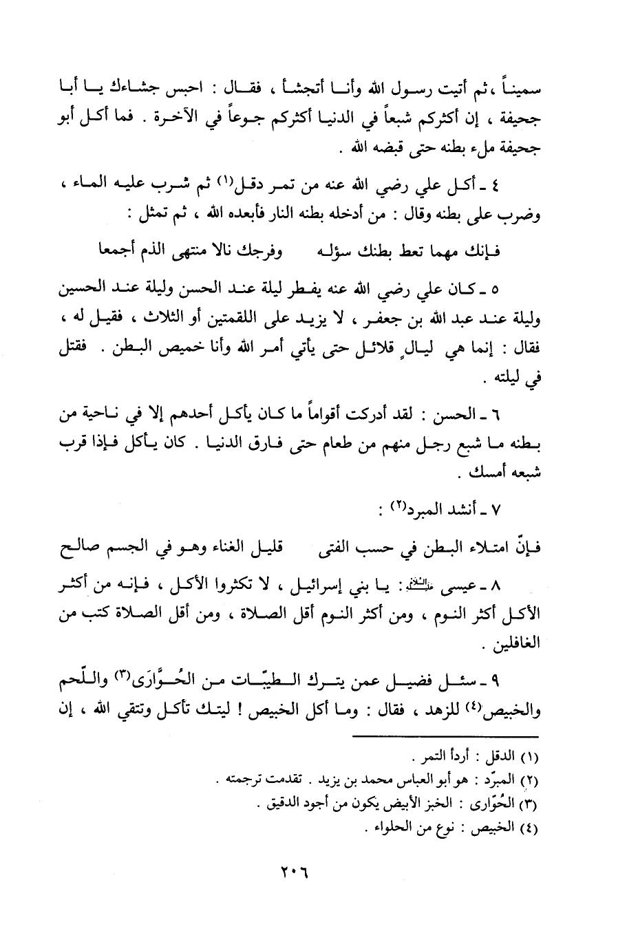 4- أكل علي رضي الله عنه من تمر دقل «1» ثم شرب عليه الماء، وضرب على بطنه وقال: من أدخله بطنه النار فأبعده الله، ثم تمثل: