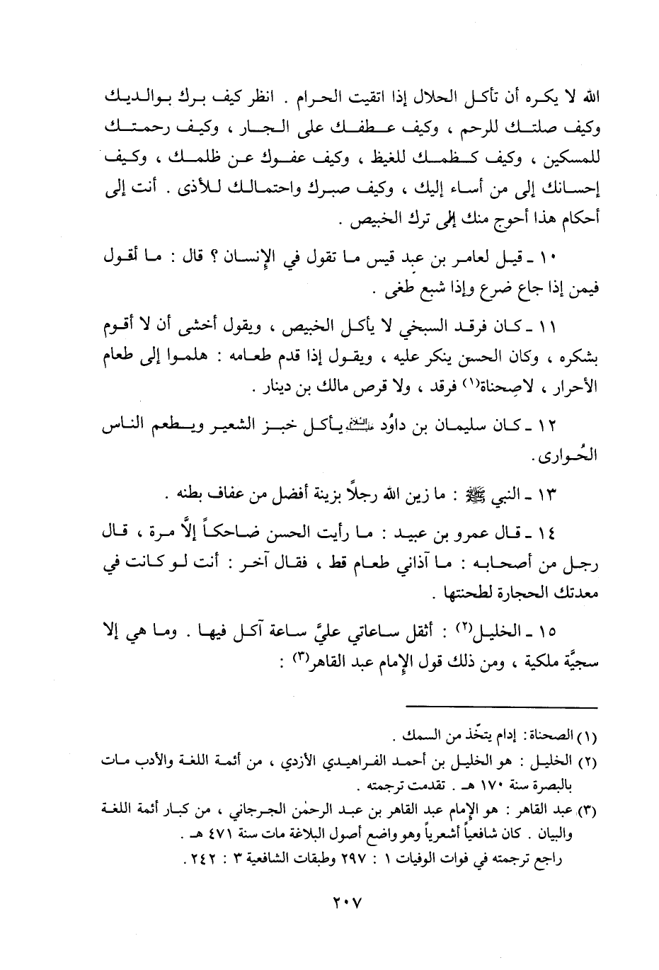 15- الخليل «2» : أثقل ساعاتي عليّ ساعة آكل فيها. وما هي إلا سجيّة ملكية، ومن ذلك قول الإمام عبد القاهر «3» :