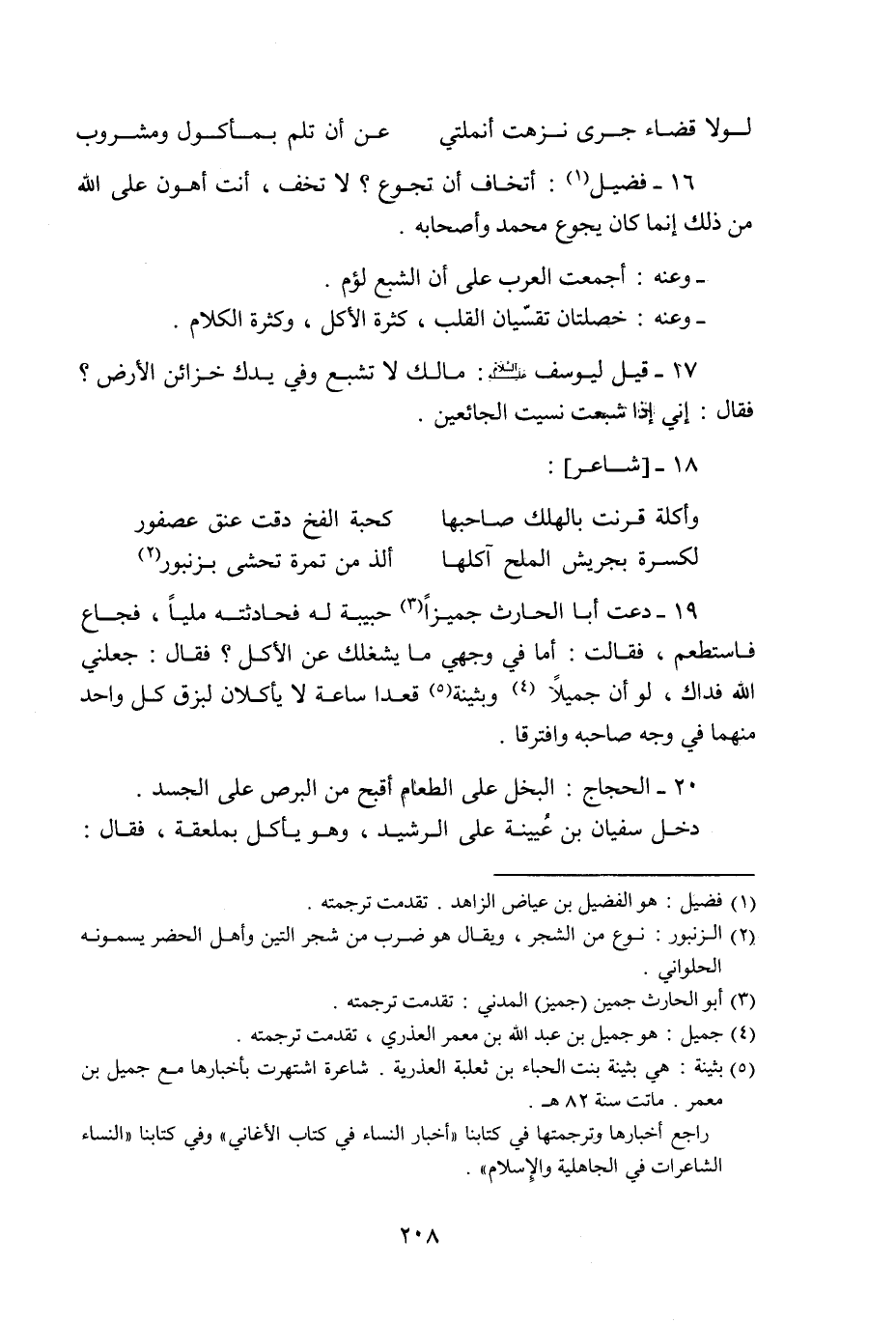 19- دعت أبا الحارث جميزا «3» حبيبة له فحادثته مليا، فجاع فاستطعم، فقالت: أما في وجهي ما يشغلك عن الأكل؟ فقال: جعلني الله فداك، لو أن جميلا «4» وبثينة «5» قعدا ساعة لا يأكلان لبزق كل واحد منهما في وجه صاحبه وافترقا.