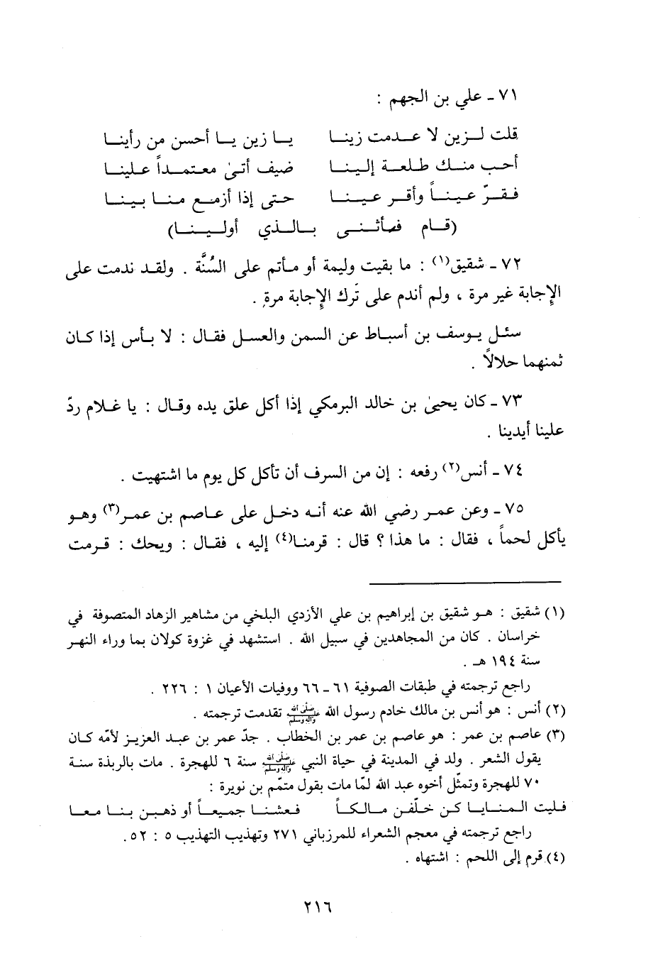 72- شقيق «1» : ما بقيت وليمة أو مأتم على السنّة. ولقد ندمت على الإجابة غير مرة، ولم أندم على ترك الإجابة مرة.