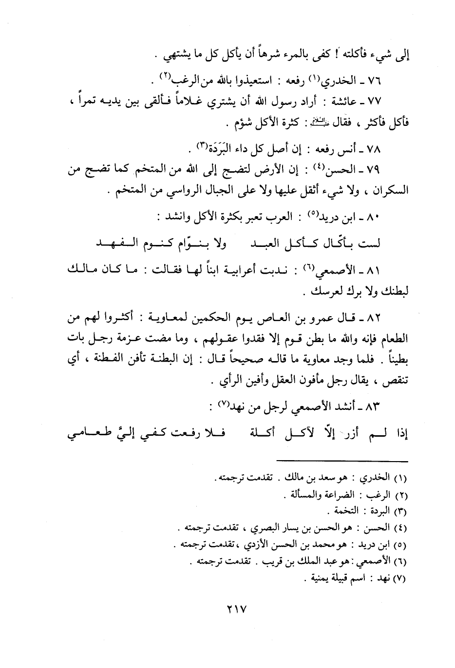 77- عائشة: أراد رسول الله أن يشتري غلاما فألقى بين يديه تمرا، فأكل فأكثر، فقال عليه السّلام: كثرة الأكل شؤم.