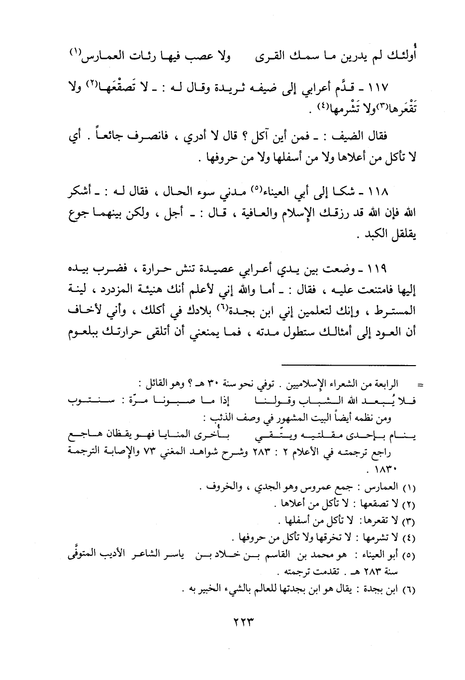 118- شكا إلى أبي العيناء «5» مدني سوء الحال، فقال له:- أشكر الله فإن الله قد رزقك الإسلام والعافية، قال:- أجل، ولكن بينهما جوع يقلقل الكبد.