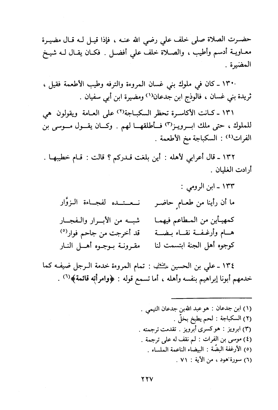 130- كان في ملوك بني غسان المروءة والترفه وطيب الأطعمة فقيل، ثريدة بني غسان، فالوذج ابن جدعان «1» ومضيرة ابن أبي سفيان.