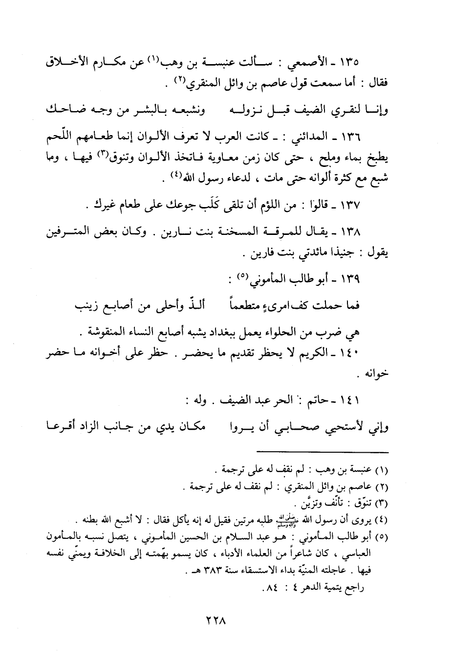 135- الأصمعي: سألت عنبسة بن وهب «1» عن مكارم الأخلاق فقال: أما سمعت قول عاصم بن وائل المنقري «2» .