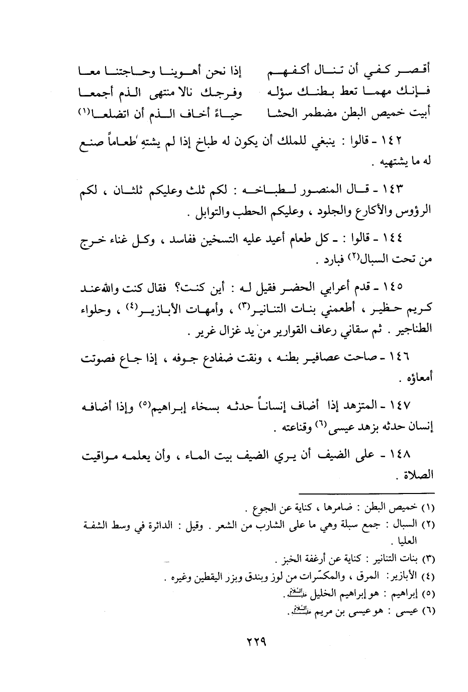 147- المتزهد إذا أضاف إنسانا حدثه بسخاء إبراهيم «5» وإذا أضافه إنسان حدثه بزهد عيسى «6» وقناعته.