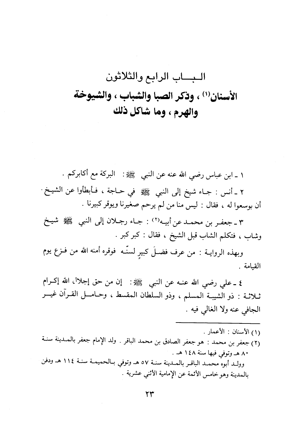 3- جعفر بن محمد عن أبيه «2» : جاء رجلان إلى النبي صلّى الله عليه وسلّم شيخ وشاب، فتكلم الشاب قبل الشيخ، فقال: كبركبر.