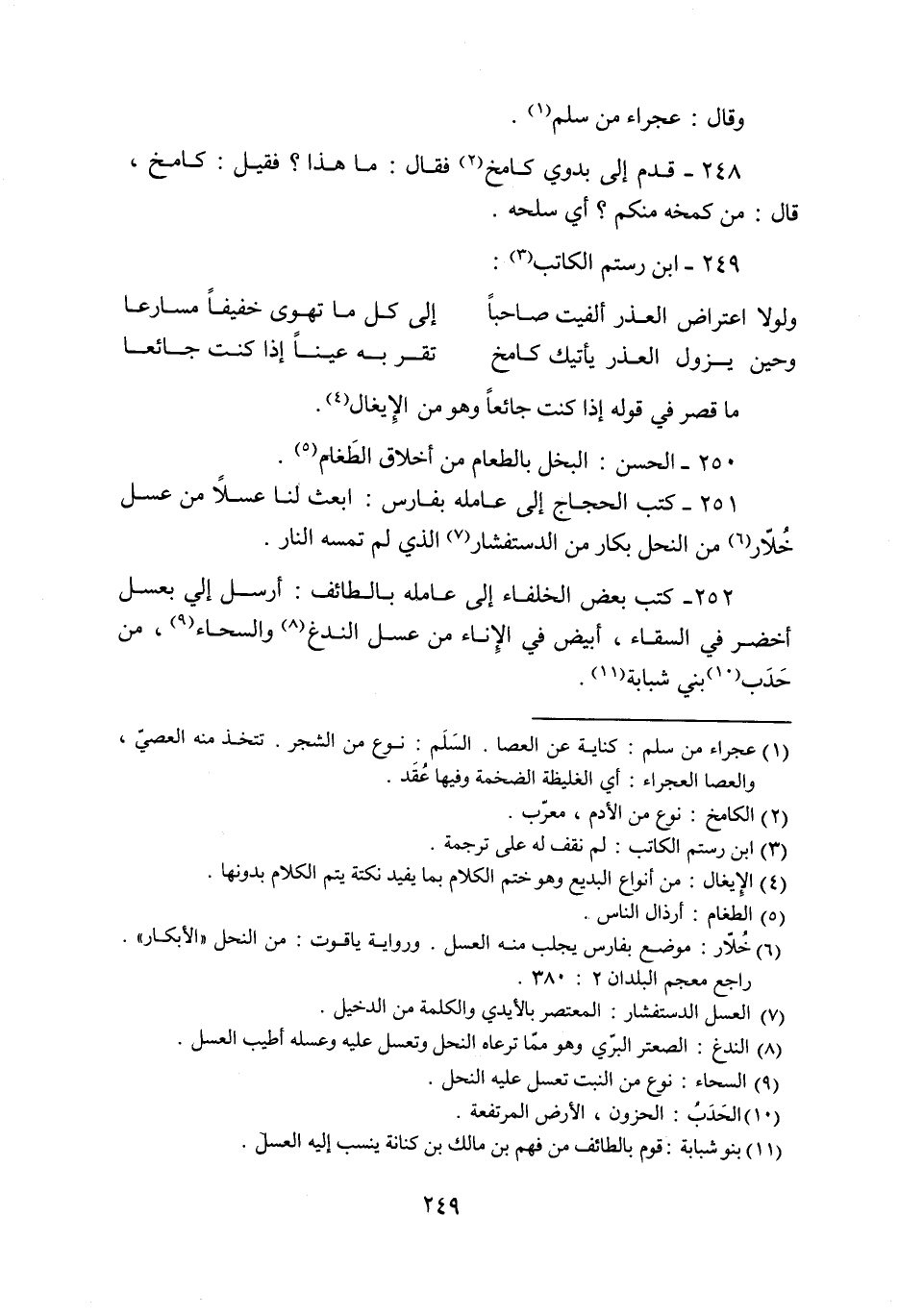 251- كتب الحجاج إلى عامله بفارس: ابعث لنا عسلا من عسل خلّار «6» من النحل بكار من الدستفشار «7» الذي لم تمسه النار.