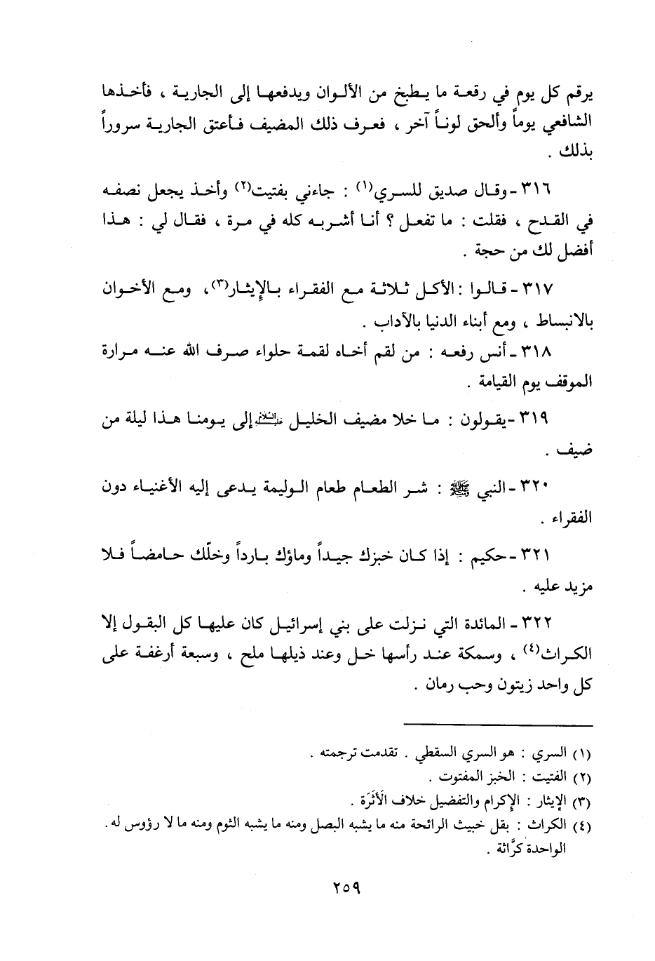 317- قالوا: الأكل ثلاثة مع الفقراء بالإيثار «3» ، ومع الأخوان بالانبساط، ومع أبناء الدنيا بالآداب.