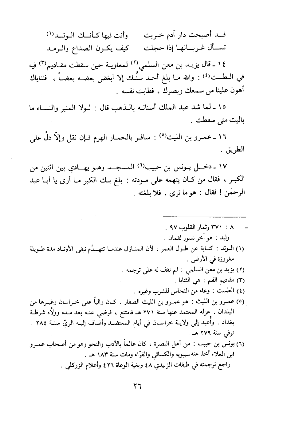 17- دخل يونس بن حبيب «6» المسجد وهو يهادي بين اثنين من الكبر، فقال من كان يتهمه على مودته: بلغ بك الكبر ما أرى يا أبا عبد الرحمن! فقال: هو ما ترى، فلا بلغته.