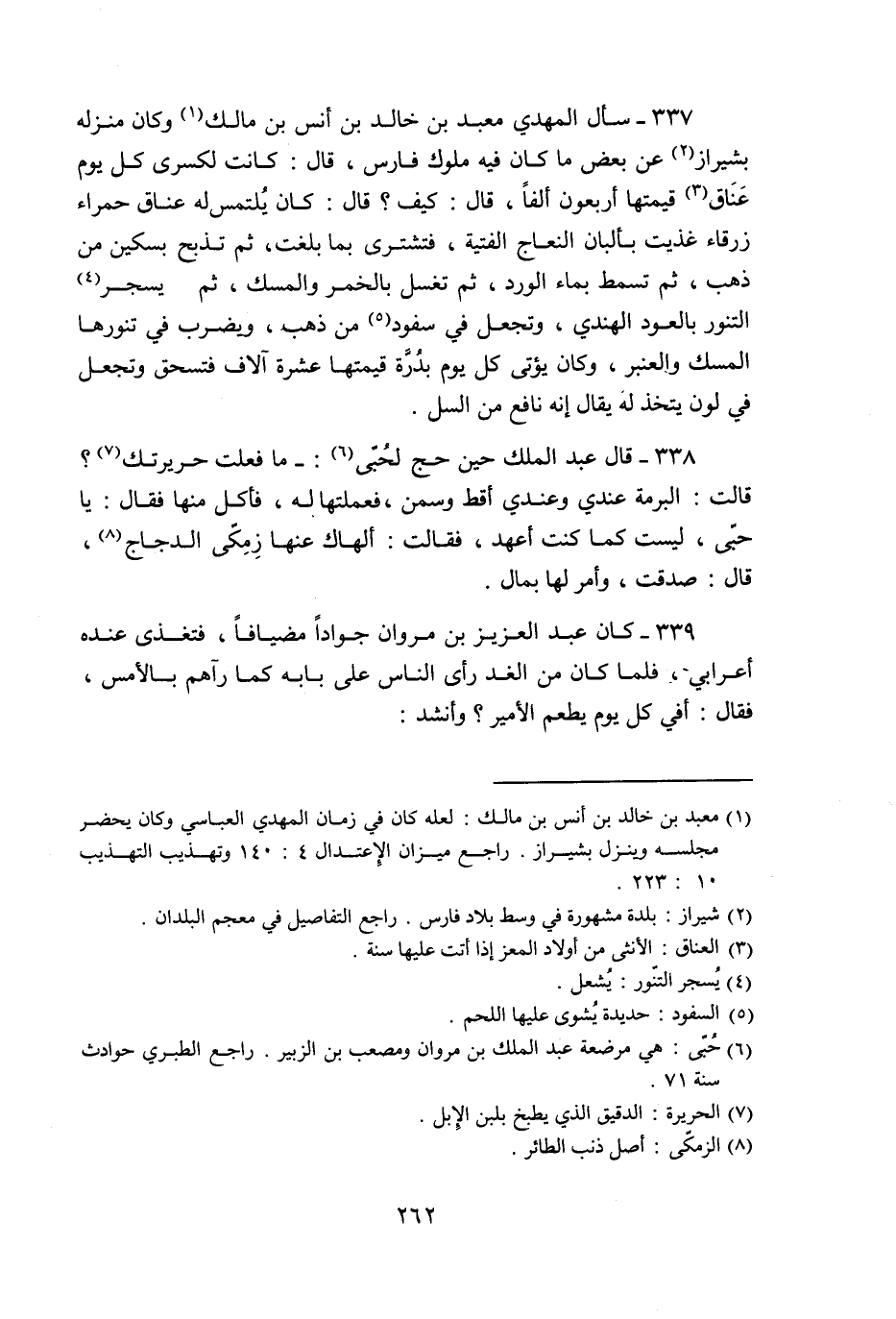 337- سأل المهدي معبد بن خالد بن أنس بن مالك «1» وكان منزله بشيراز «2» عن بعض ما كان فيه ملوك فارس، قال: كانت لكسرى كل يوم عناق «3» قيمتها أربعون ألفا، قال: كيف؟ قال: كان يلتمس له عناق حمراء زرقاء غذيت بألبان النعاج الفتية، فتشترى بما بلغت، ثم تذبح بسكين من ذهب، ثم تسمط بماء الورد، ثم تغسل بالخمر والمسك، ثم يسجر «4» التنور بالعود الهندي، وتجعل في سفود «5» من ذهب، ويضرب في تنورها المسك والعنبر، وكان يؤتى كل يوم بدرّة قيمتها عشرة آلاف فتسحق وتجعل في لون يتخذ له يقال إنه نافع من السل.