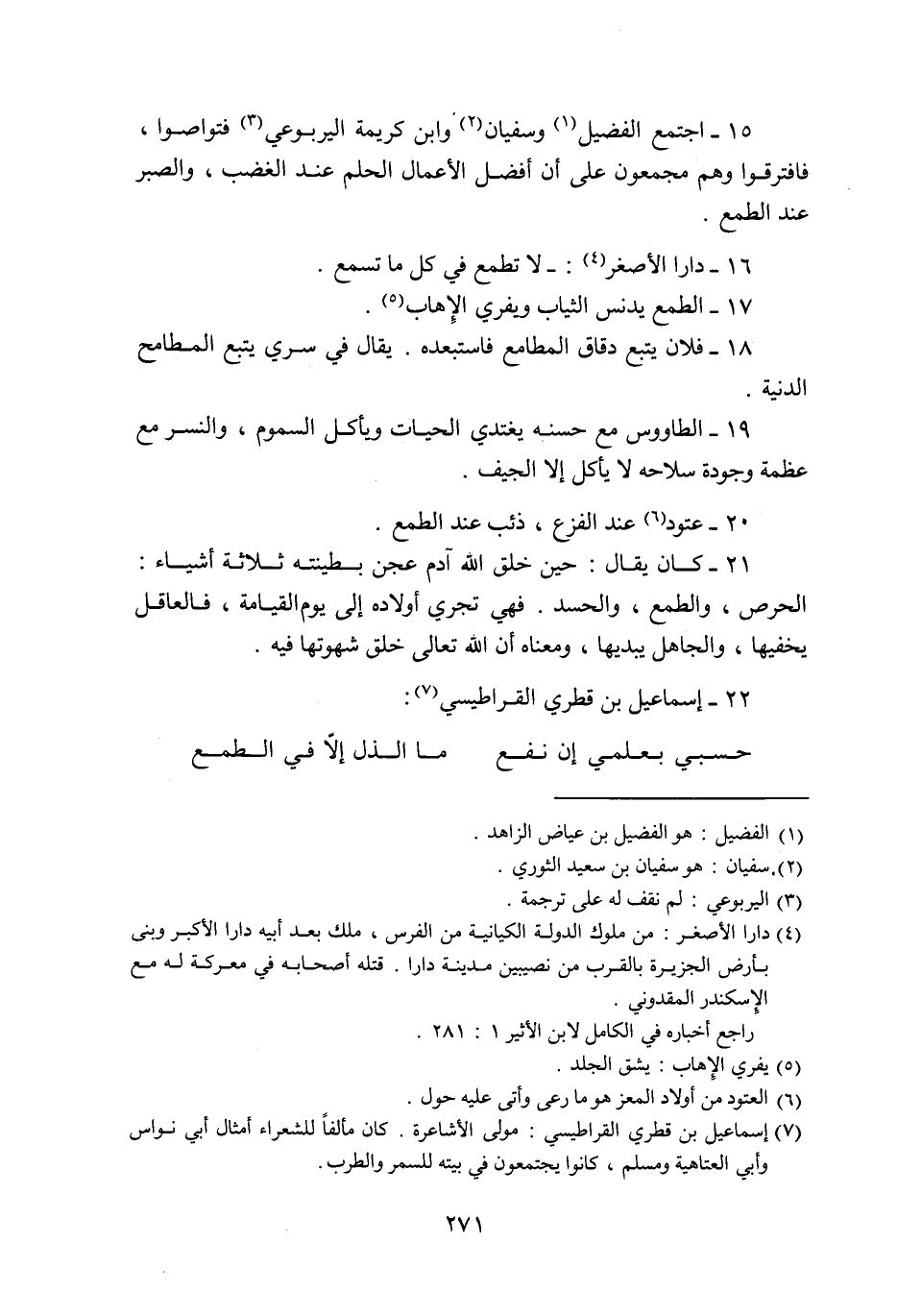 15- اجتمع الفضيل «1» وسفيان «2» وابن كريمة اليربوعي «3» فتواصوا، فافترقوا وهم مجمعون على أن أفضل الأعمال الحلم عند الغضب، والصبر عند الطمع.