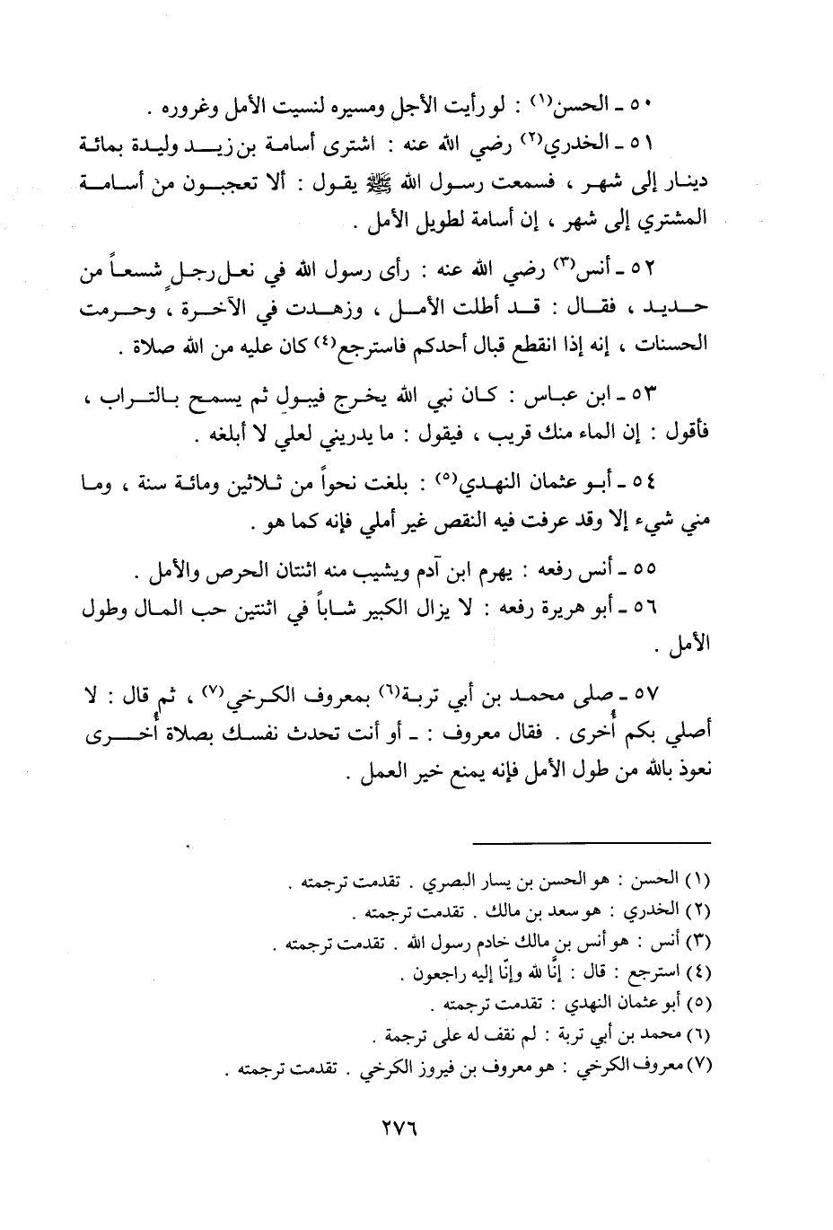52- أنس «3» رضي الله عنه: رأى رسول الله في نعل رجل شسعا من حديد، فقال: قد أطلت الأمل، وزهدت في الآخرة، وحرمت الحسنات، إنه إذا انقطع قبال أحدكم فاسترجع «4» كان عليه من الله صلاة.