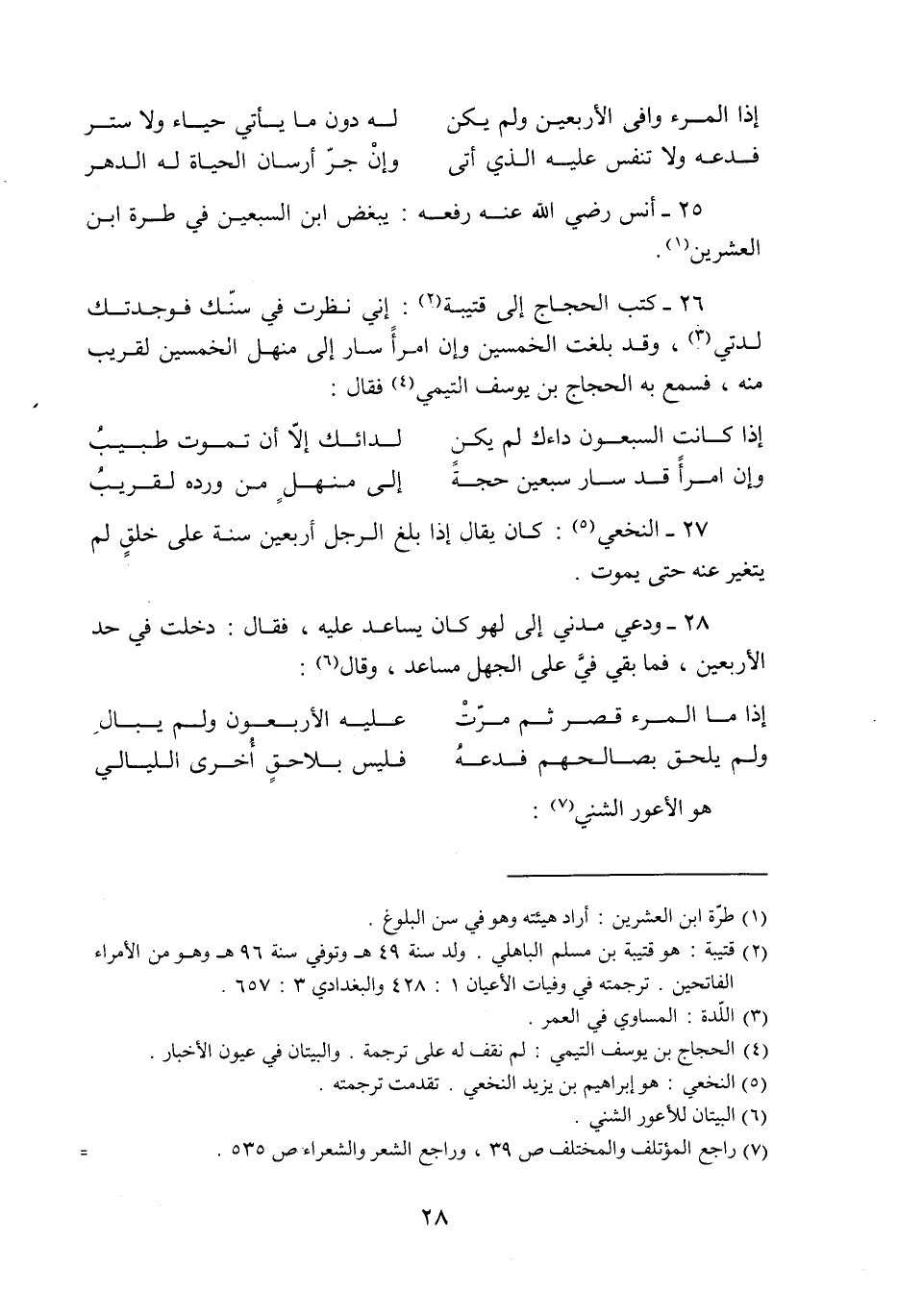 28- ودعي مدني إلى لهو كان يساعد عليه، فقال: دخلت في حد الأربعين، فما بقي فيّ على الجهل مساعد، وقال «6» :