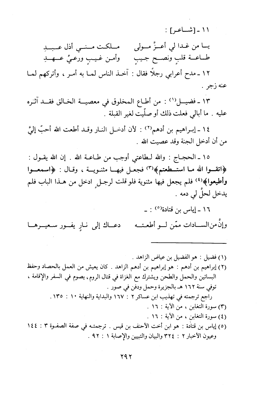 14- إبراهيم بن أدهم «2» : لأن أدخل النار وقد أطعت الله أحبّ إليّ من أن أدخل الجنة وقد عصيت الله.