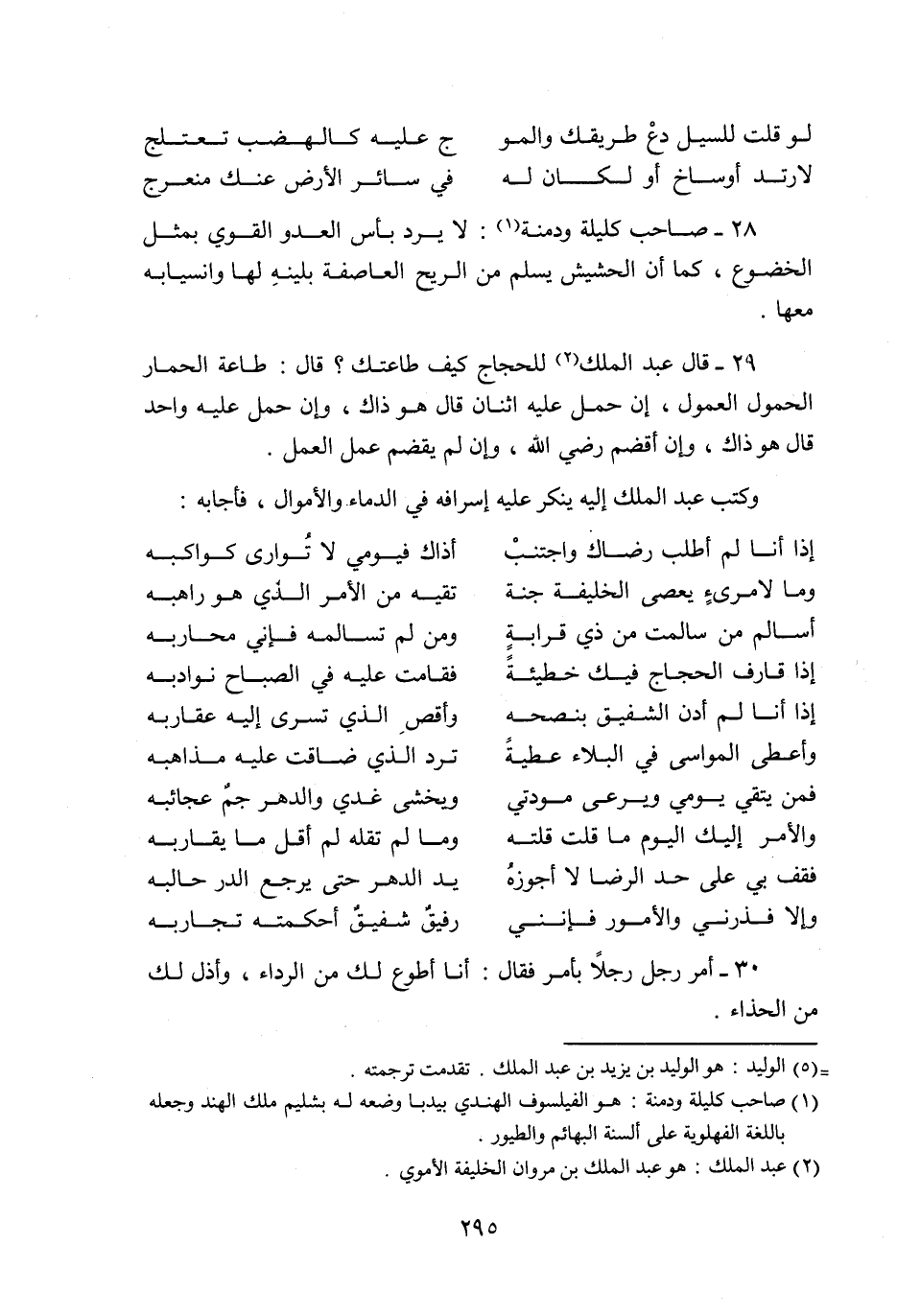 28- صاحب كليلة ودمنة «1» : لا يرد بأس العدو القوي بمثل الخضوع، كما أن الحشيش يسلم من الريح العاصفة بلينه لها وانسيابه معها.