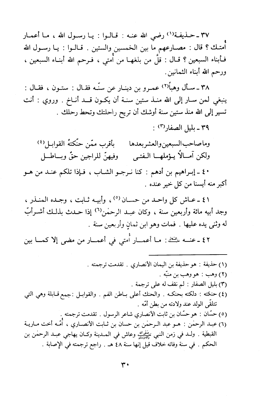 37- حذيفة «1» رضي الله عنه: قالوا: يا رسول الله، ما أعمار أمتك؟ قال: مصارعهم ما بين الخمسين والستين. قالوا: يا رسول الله فأبناء السبعين؟ قال: قلّ من بلغها من أمتي، فرحم الله أبناء السبعين، ورحم الله أبناء الثمانين.