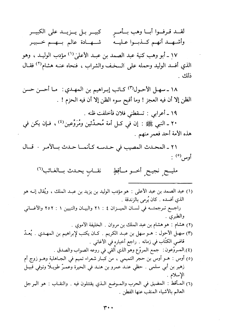17- أبو وهب كنية عبد الصمد بن عبد الأعلى «1» مؤدب الوليد، وهو الذي أفسد الوليد وحمله على السخف والشراب، فنحاه عنه هشام «2» فقال ذلك.
