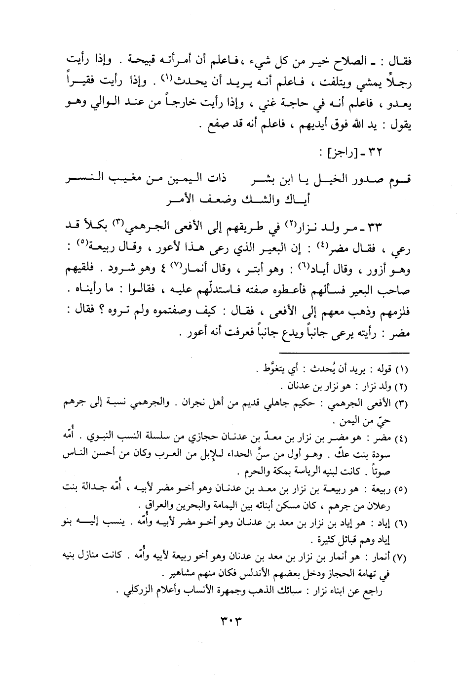 33- مر ولد نزار «2» في طريقهم إلى الأفعى الجرهمي «3» بكلأ قد رعي، فقال مضر «4» : إن البعير الذي رعى هذا لأعور، وقال ربيعة «5» :