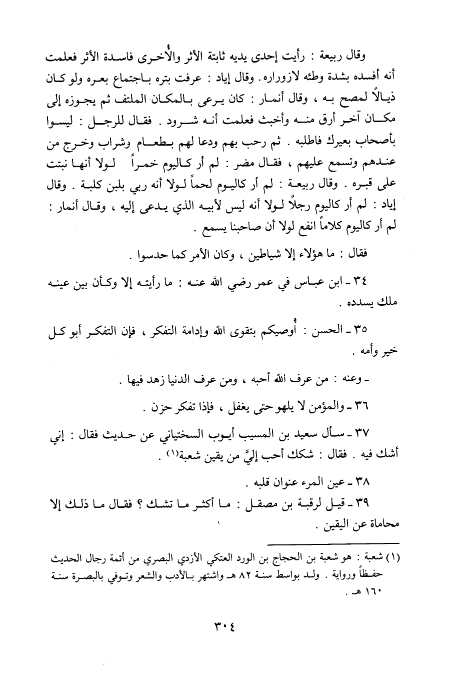 39- قيل لرقبة بن مصقل: ما أكثر ما تشك؟ فقال ما ذلك إلا محاماة عن اليقين.