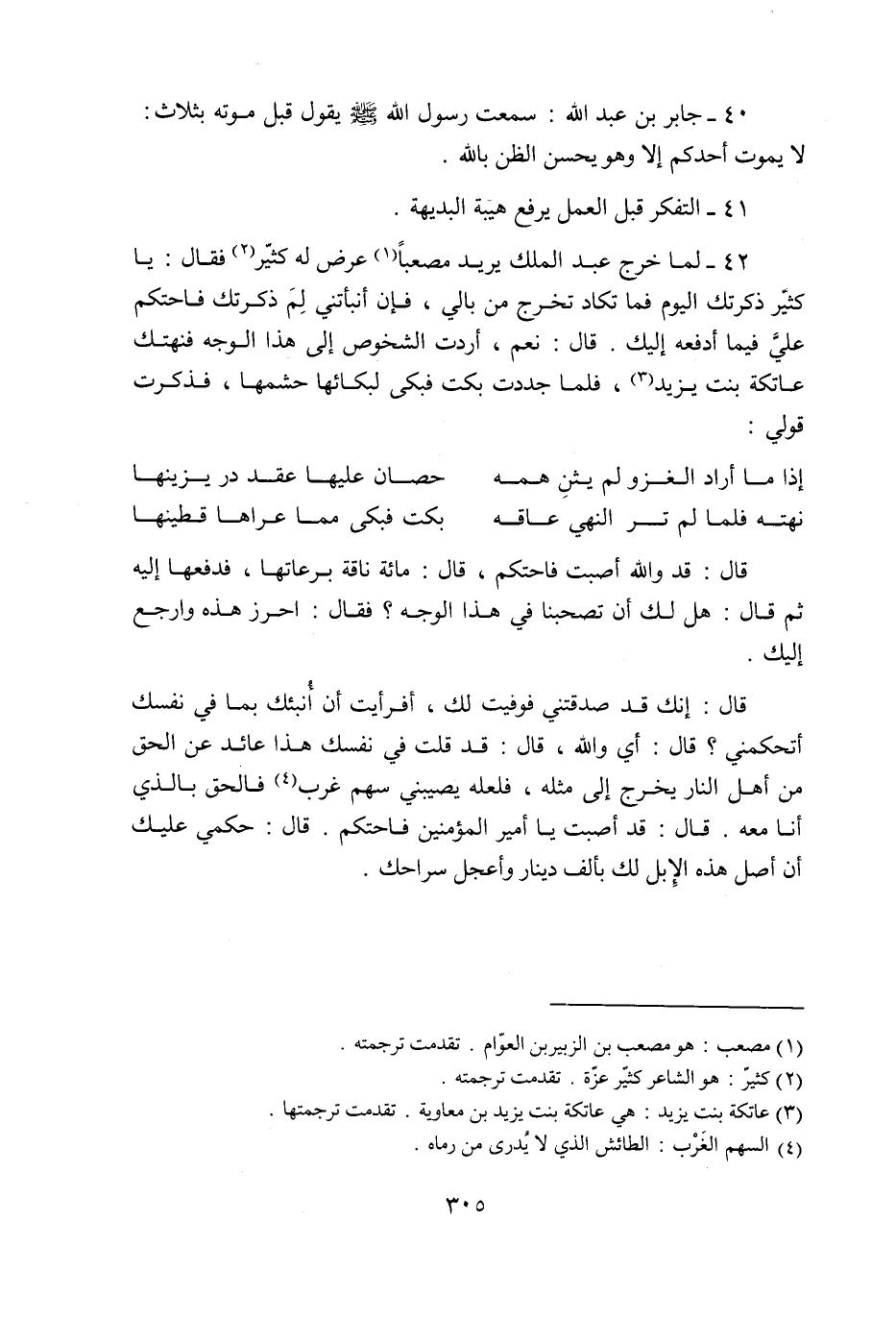 42- لما خرج عبد الملك يريد مصعبا «1» عرض له كثيّر «2» فقال: يا كثيّر ذكرتك اليوم فما تكاد تخرج من بالي، فإن أنبأتني لم ذكرتك فاحتكم عليّ فيما أدفعه إليك. قال: نعم، أردت الشخوص إلى هذا الوجه فنهتك عاتكة بنت يزيد «3» ، فلما جددت بكت فبكى لبكائها حشمها، فذكرت قولي: