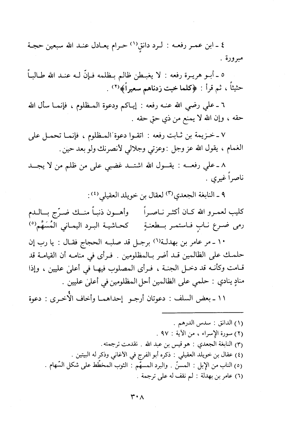 5- أبو هريرة رفعه: لا يغبطن ظالم بظلمه فإنّ له عند الله طالبا حثيثا، ثم قرأ: كُلَّما خَبَتْ زِدْناهُمْ سَعِيراً