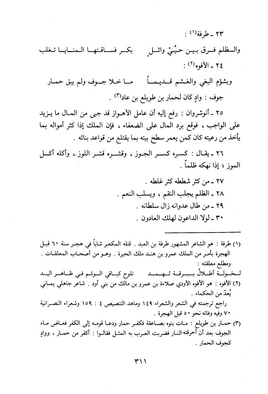 25- أنو شروان: رفع إليه أن عامل الأهواز قد جبى من المال ما يزيد على الواجب، فوقع برد المال على الضعفاء، فإن الملك إذا كثر أمواله بما يأخذ من رعيته كان كمن يعمر سطح بيته بما يقتلع من قواعد بنائه.