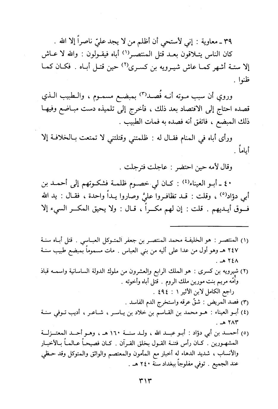 كان الناس يتلاقون بعد قتل المنتصر «1» أباه فيقولون: والله لا عاش إلا ستة أشهر كما عاش شيرويه بن كسرى»